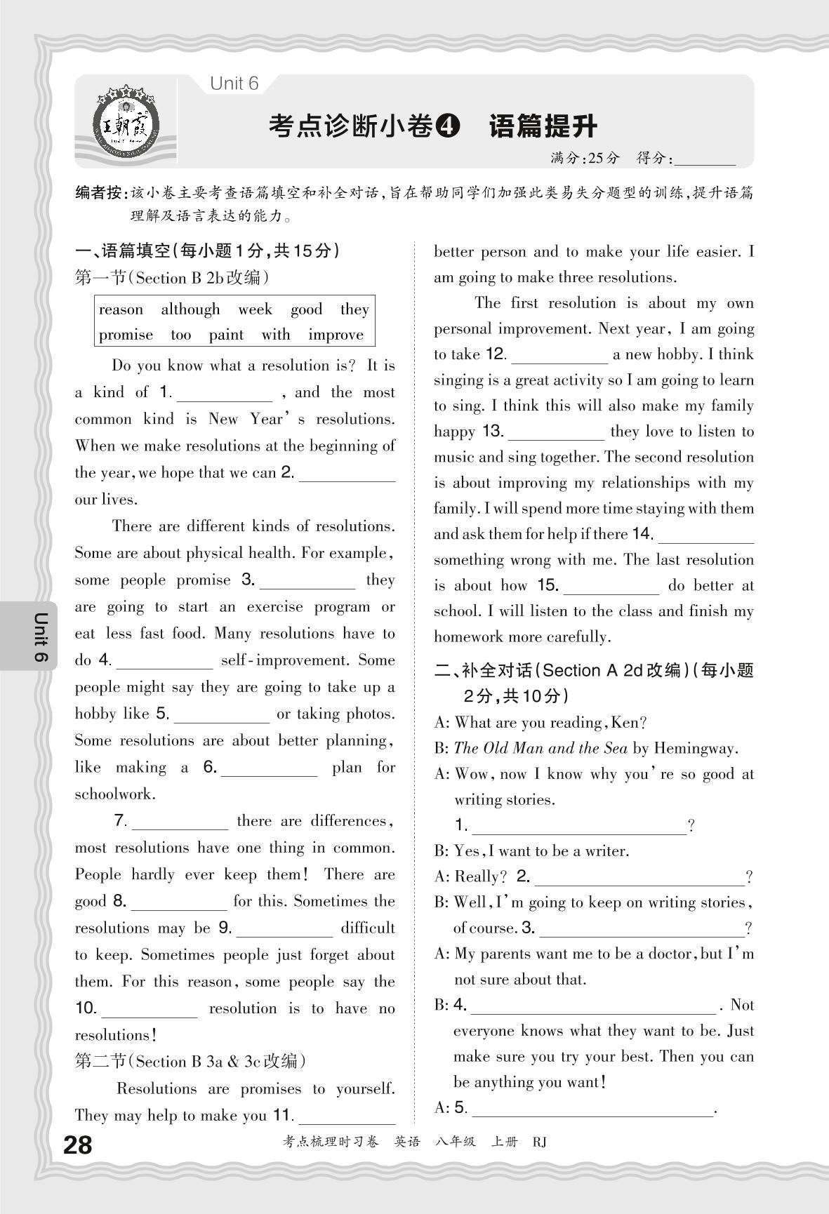 2024秋上册八年级英语人教版 Unit 6 考点诊断小卷4 语篇提升