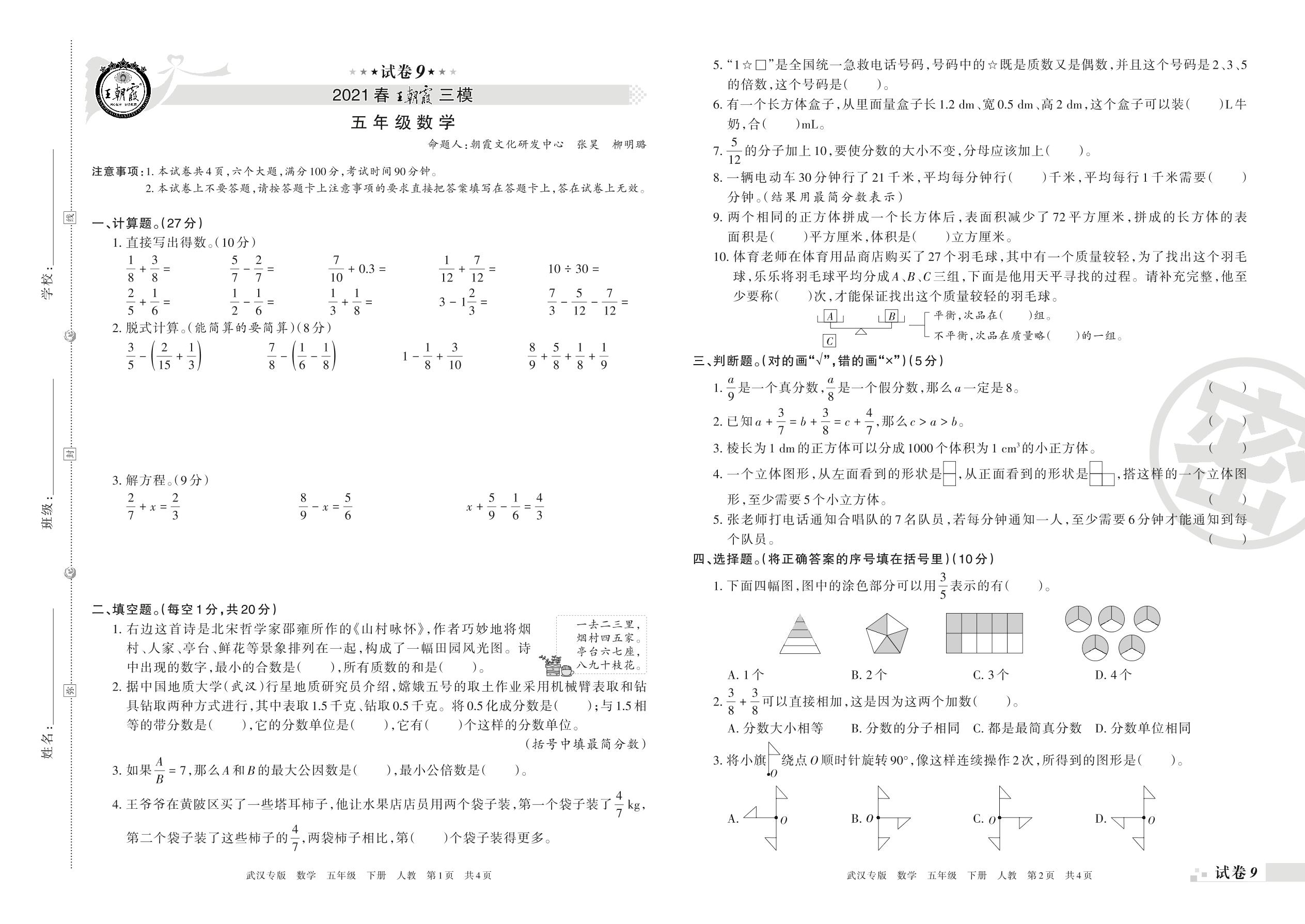 王朝霞期末模拟卷五年级下册数学(人教版)_R210804163636【9】