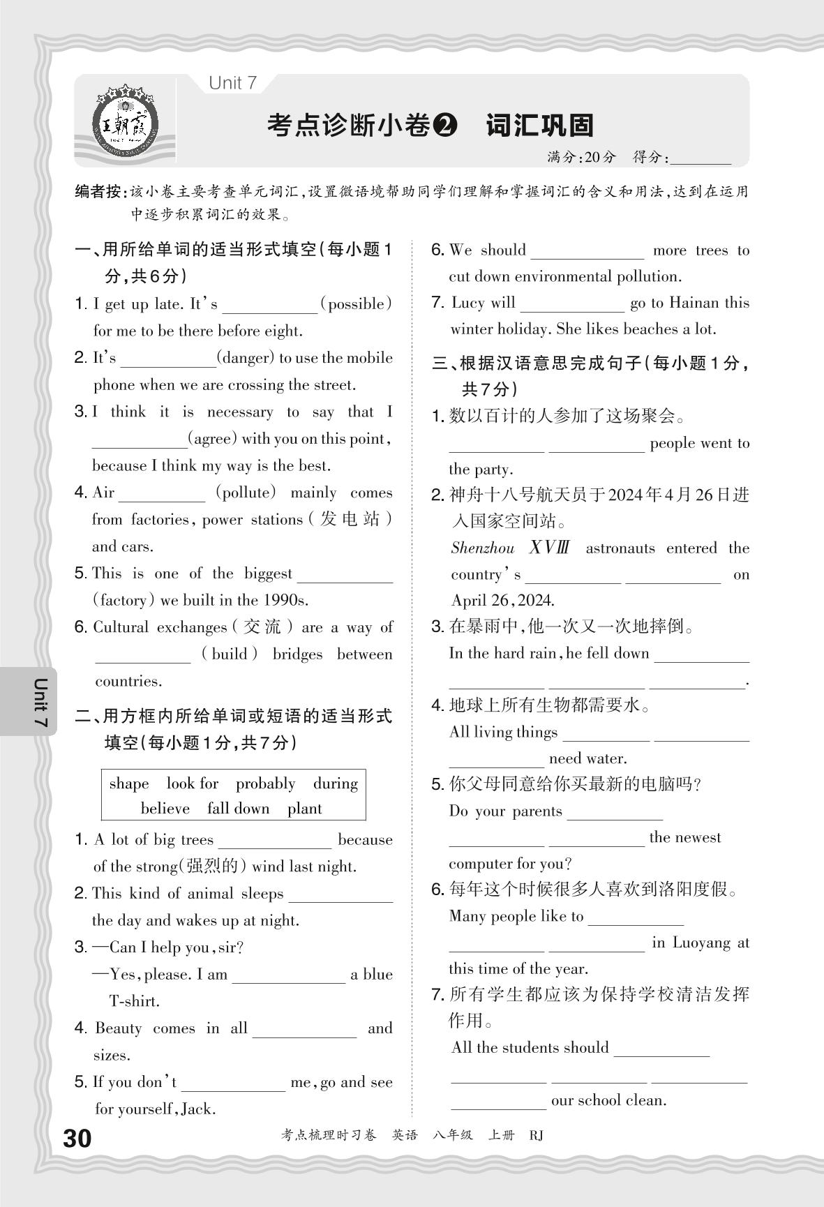 2024秋上册八年级英语人教版 Unit 7 考点诊断小卷2 词汇巩固