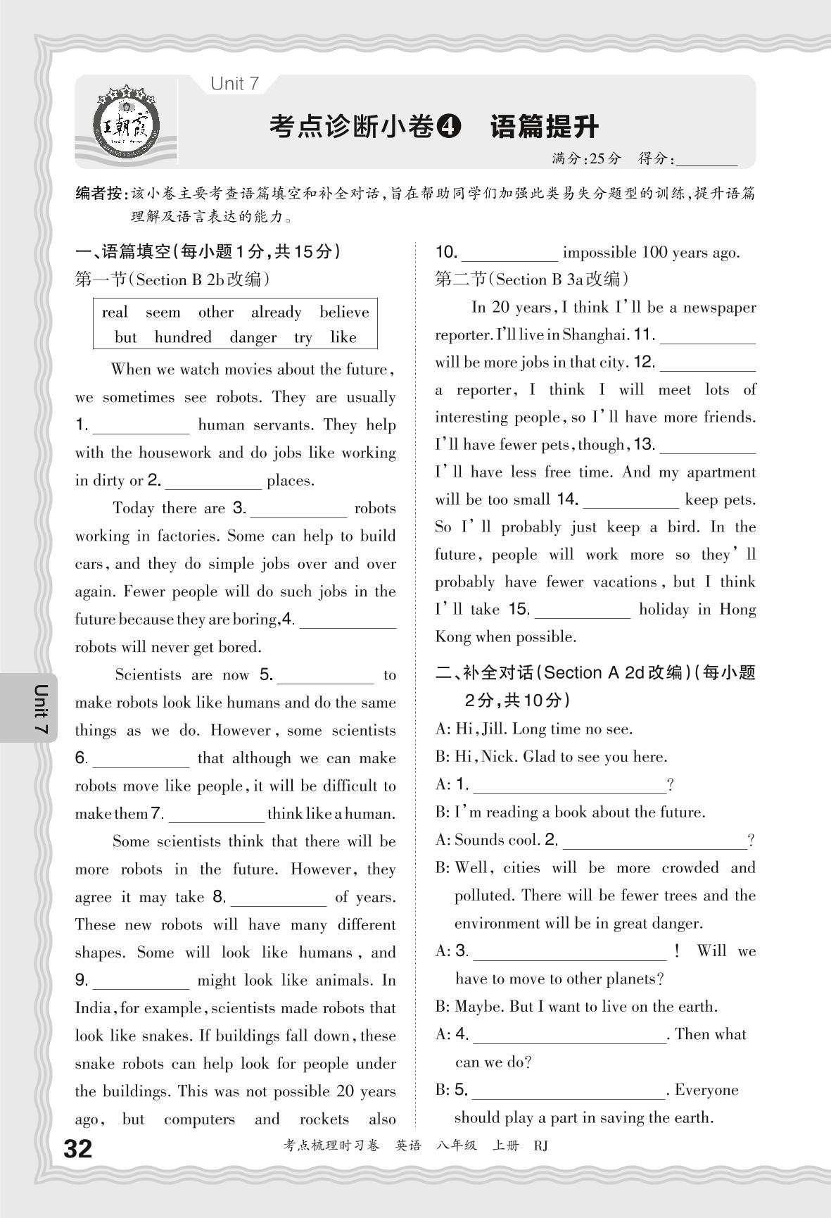 2024秋上册八年级英语人教版 Unit 7 考点诊断小卷4 语篇提升