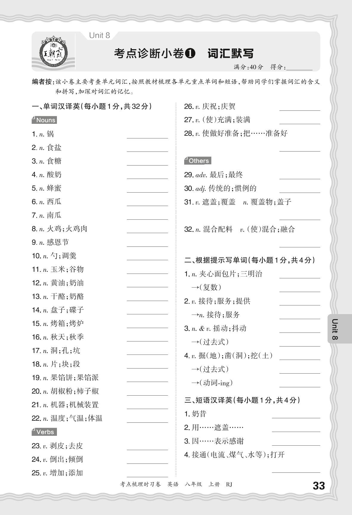 2024秋上册八年级英语人教版 Unit 8 考点诊断小卷1 词汇默写