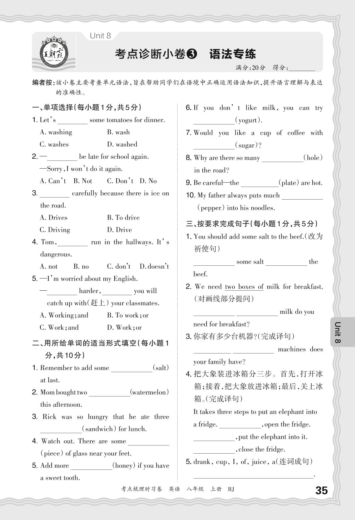 2024秋上册八年级英语人教版 Unit 8 考点诊断小卷3 语法专练
