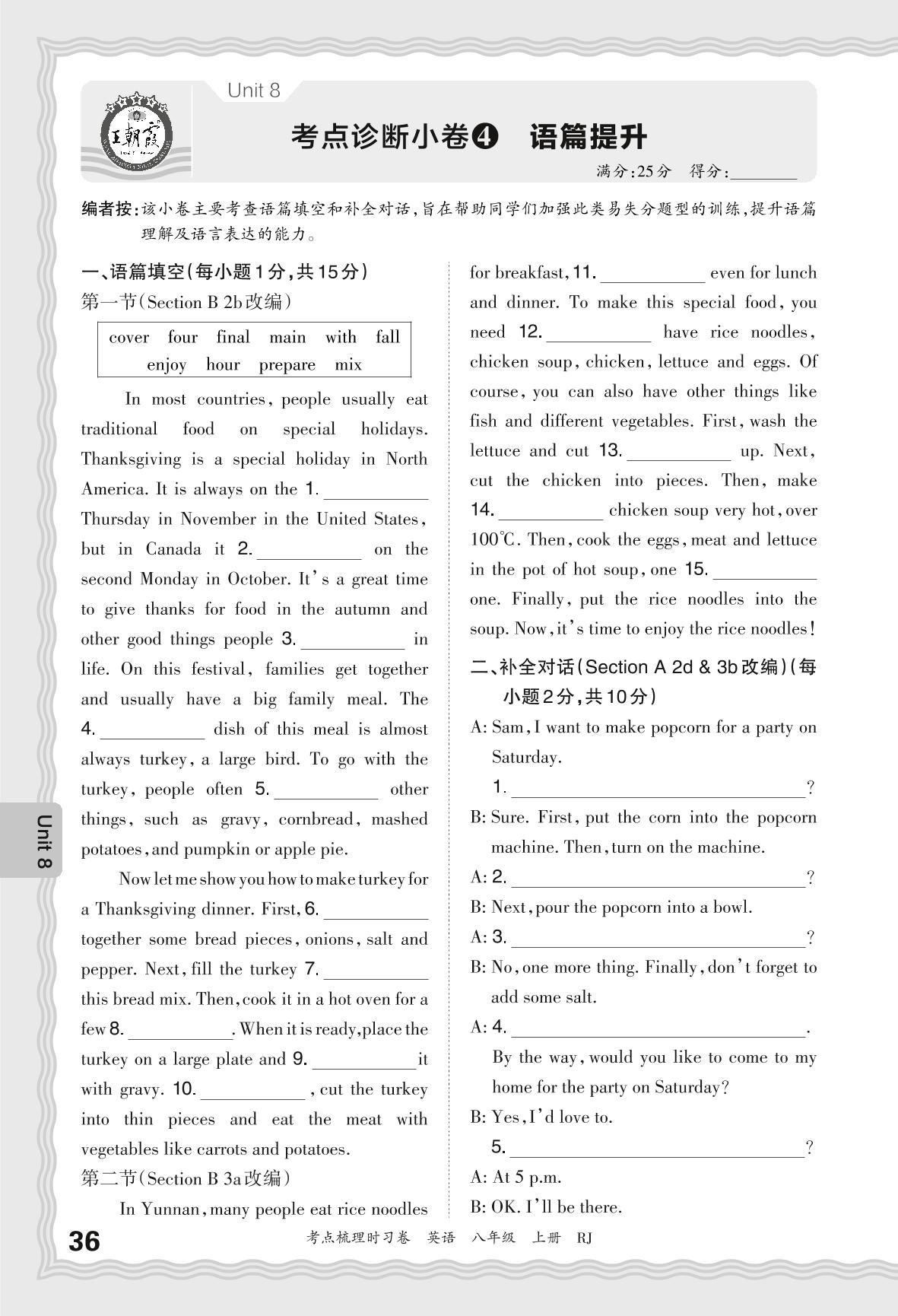 2024秋上册八年级英语人教版 Unit 8 考点诊断小卷4 语篇提升