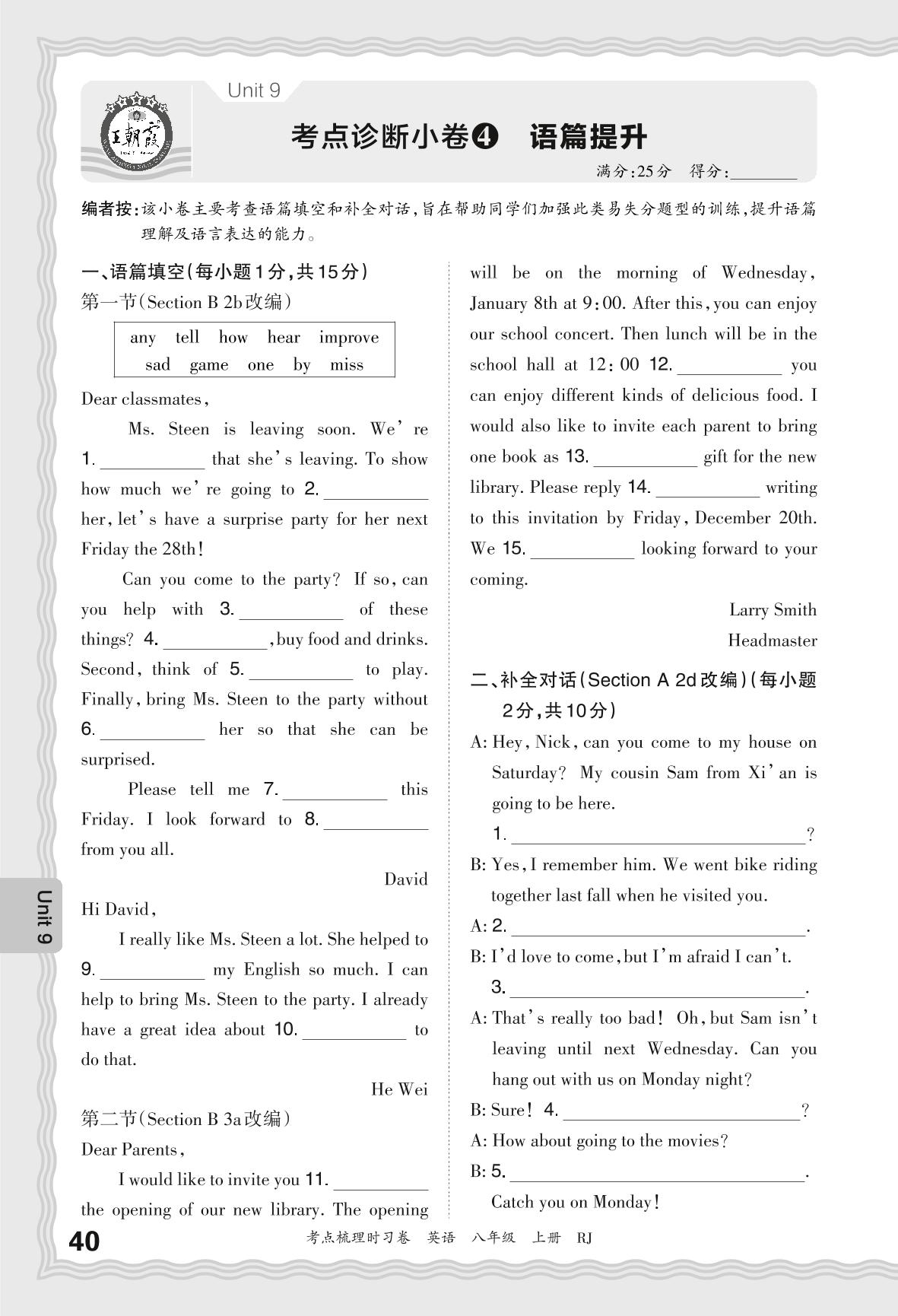 2024秋上册八年级英语人教版 Unit 9 考点诊断小卷4 语篇提升