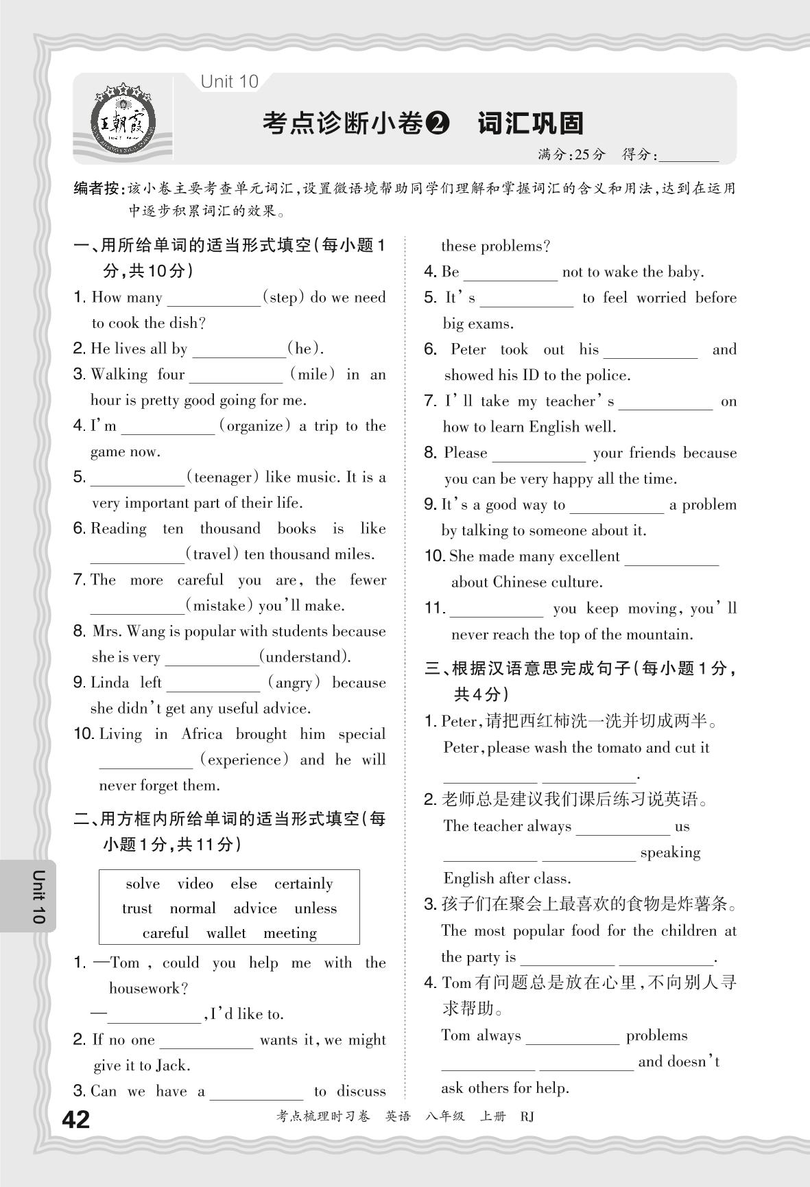 2024秋上册八年级英语人教版 Unit 10 考点诊断小卷2 词汇巩固