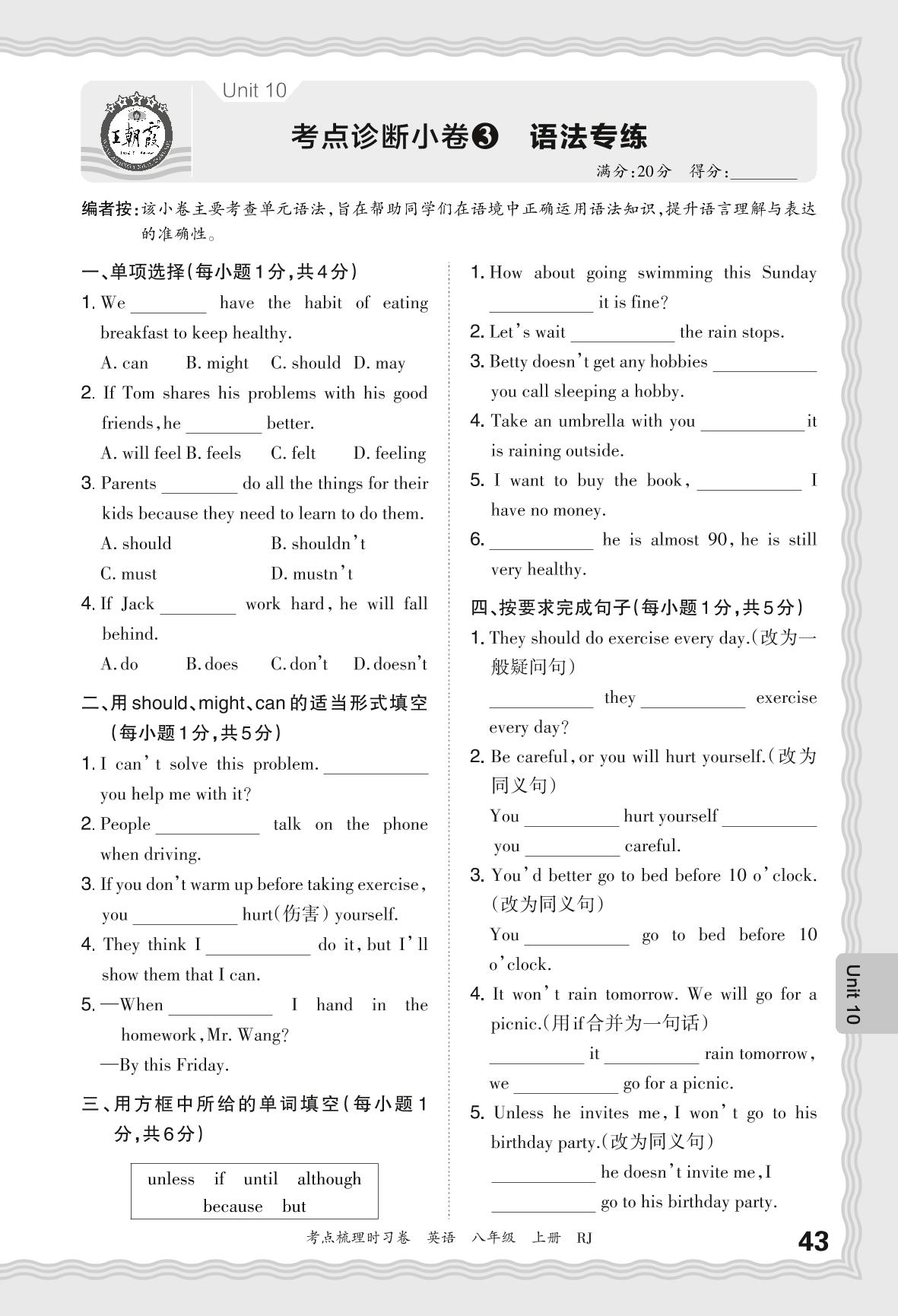 2024秋上册八年级英语人教版 Unit 10 考点诊断小卷3 语法专练