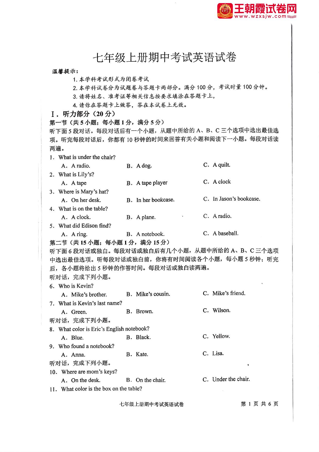 七年级英语人教版上册期中卷