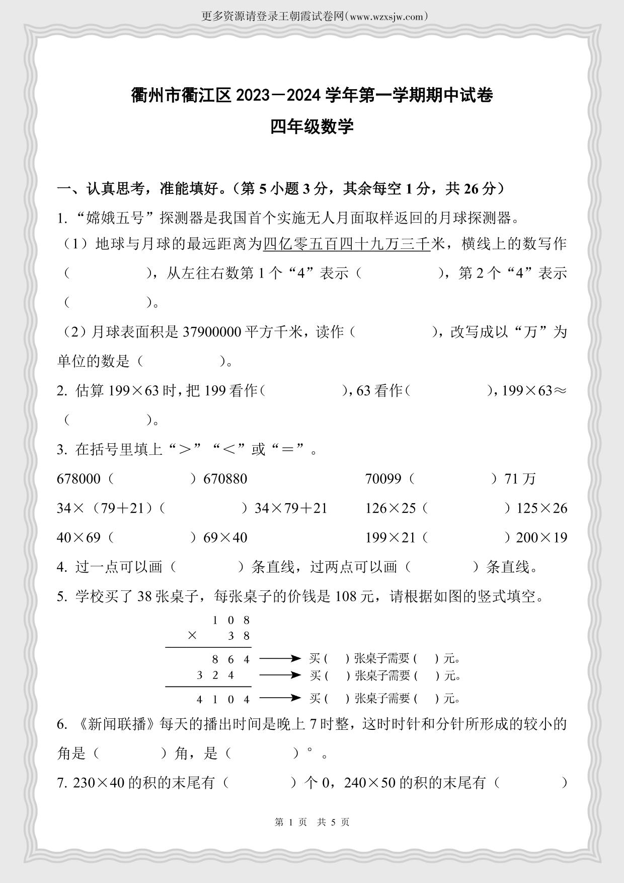 浙江省衢州市衢江区2023-2024学年第一学期期中试卷四年级数学(北师版)