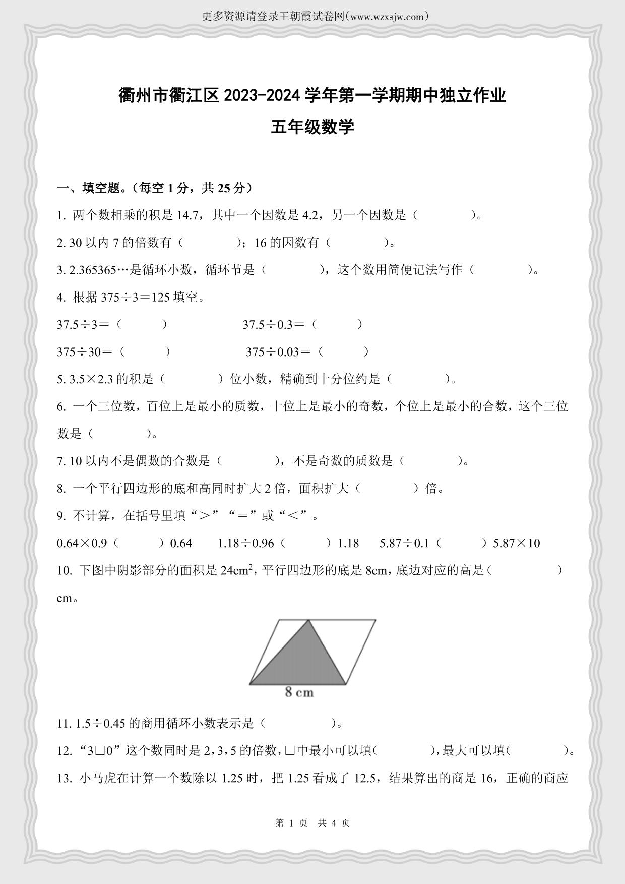 浙江省衢州市衢江区2023-2024学年第一学期期中独立作业五年级数学(北师版)