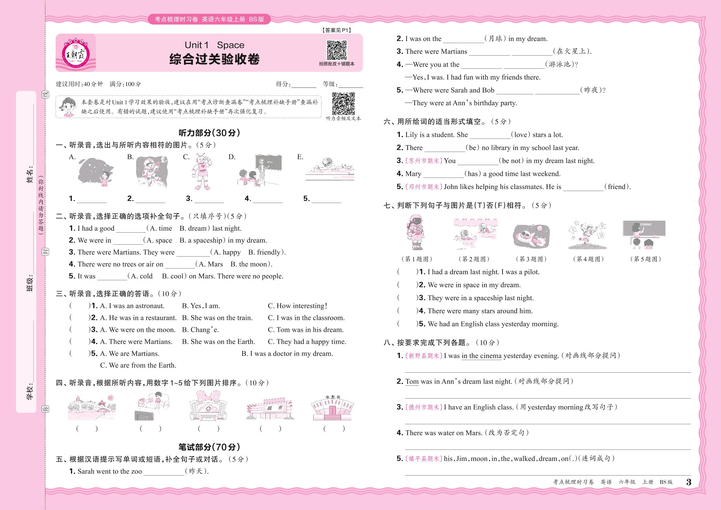 2024秋上册六年级英语北师版 Unit 1 综合过关验收卷