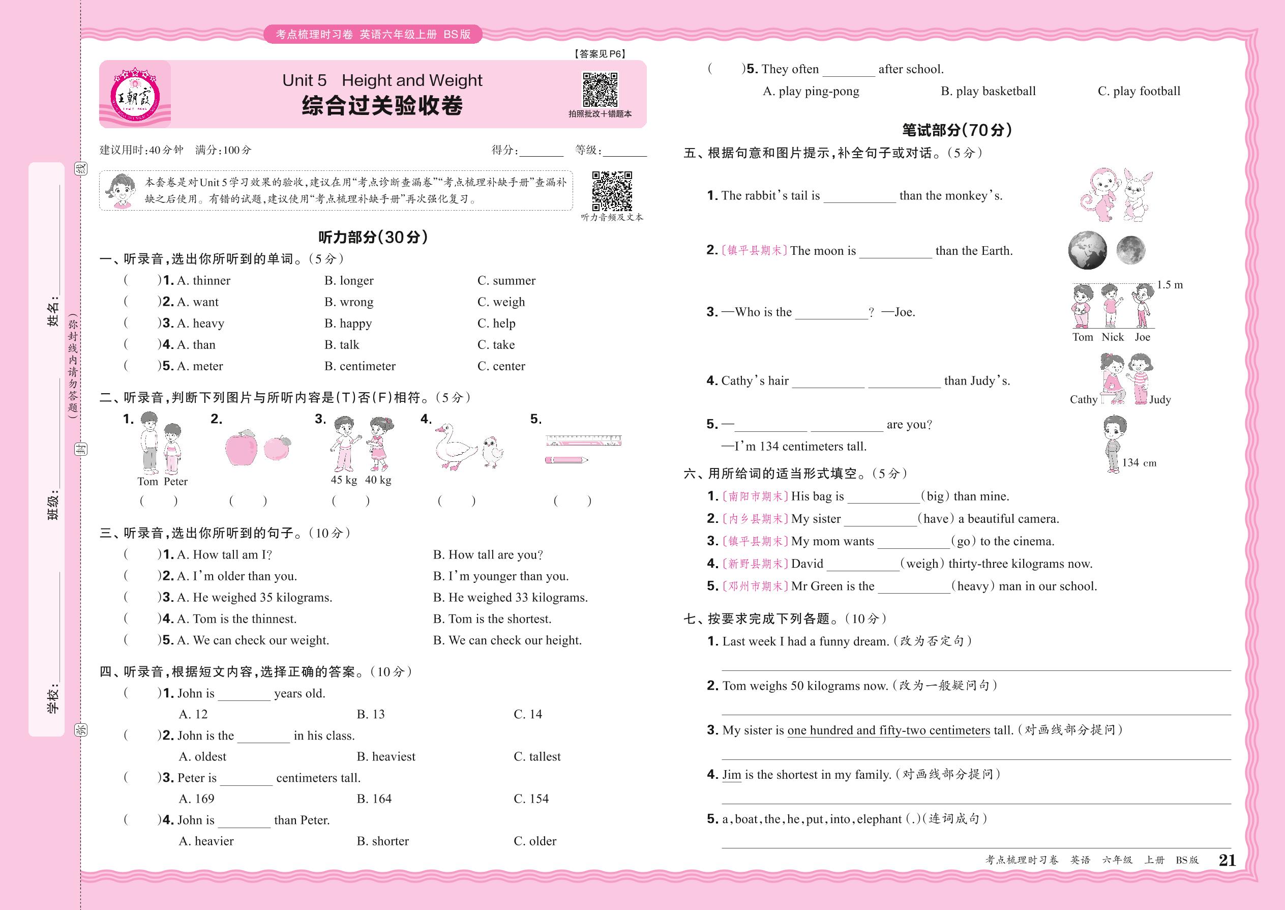 六年级英语北师版上册单元卷