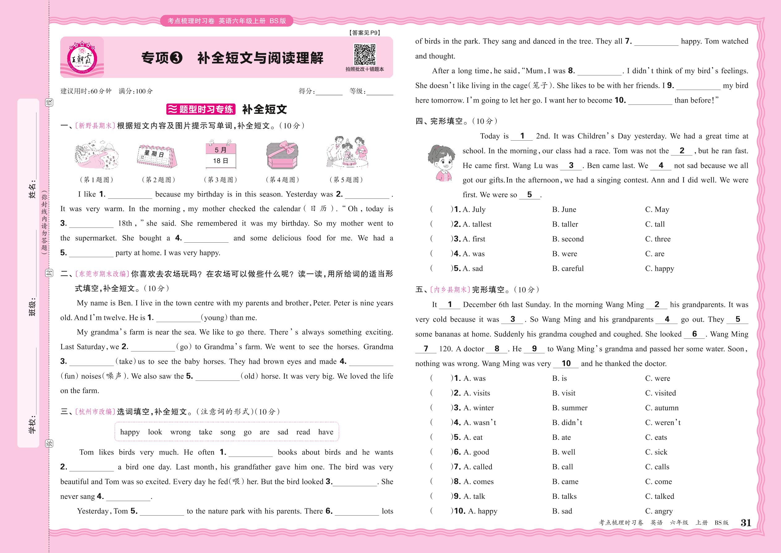 2024秋上册六年级英语北师版 期末专项卷KD版·补全短文与阅读理解【3】