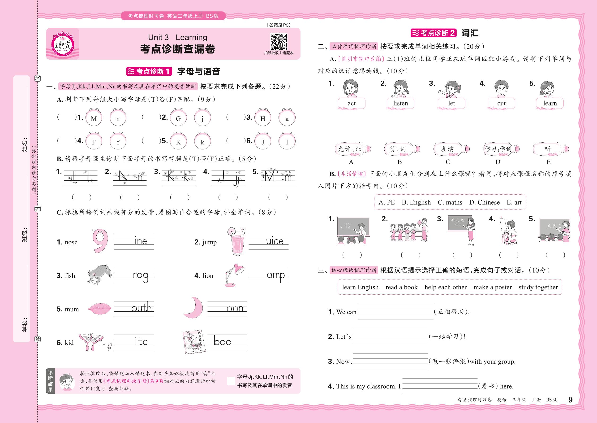 2024秋上册三年级英语北师版 Unit 3 考点诊断查漏卷