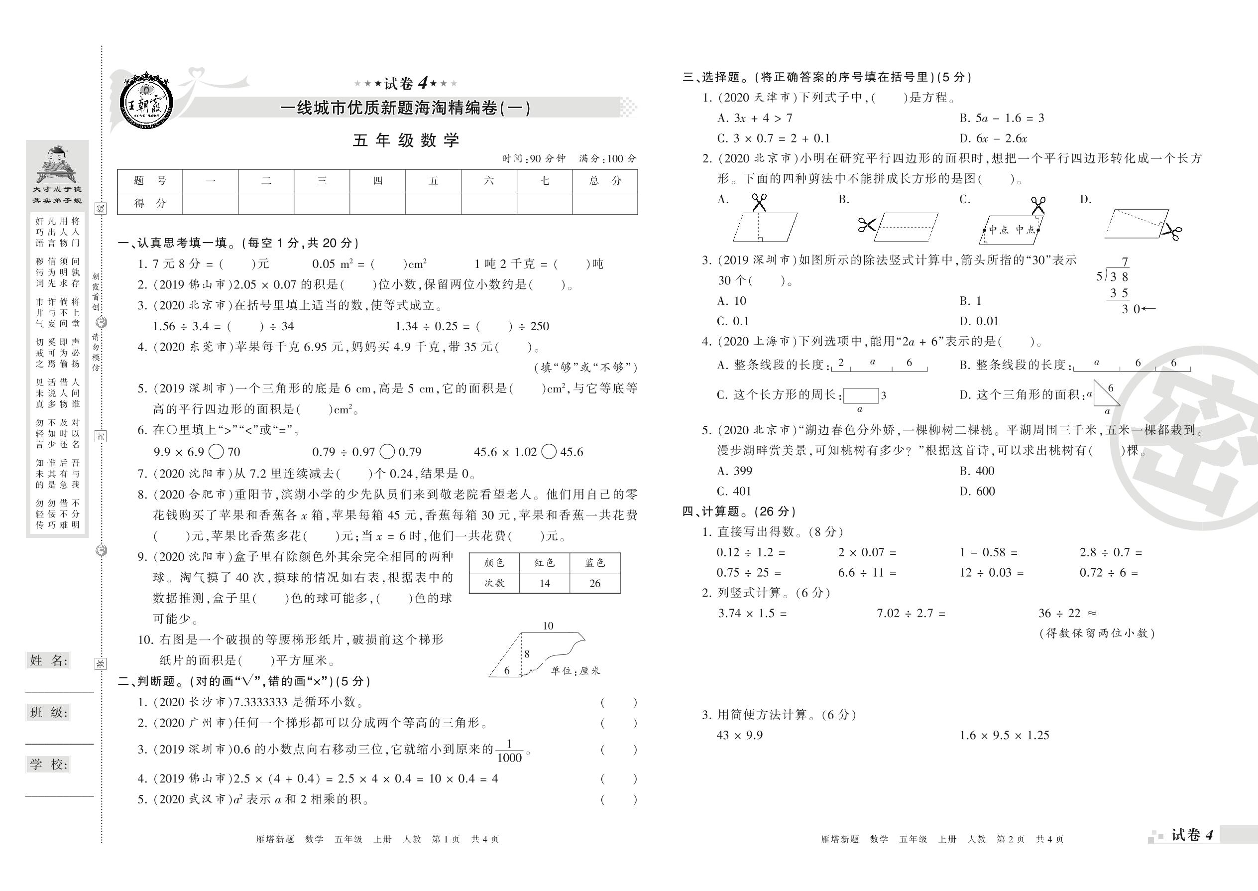 王朝霞海淘期末精编卷五年级上册数学(人教版)【4】