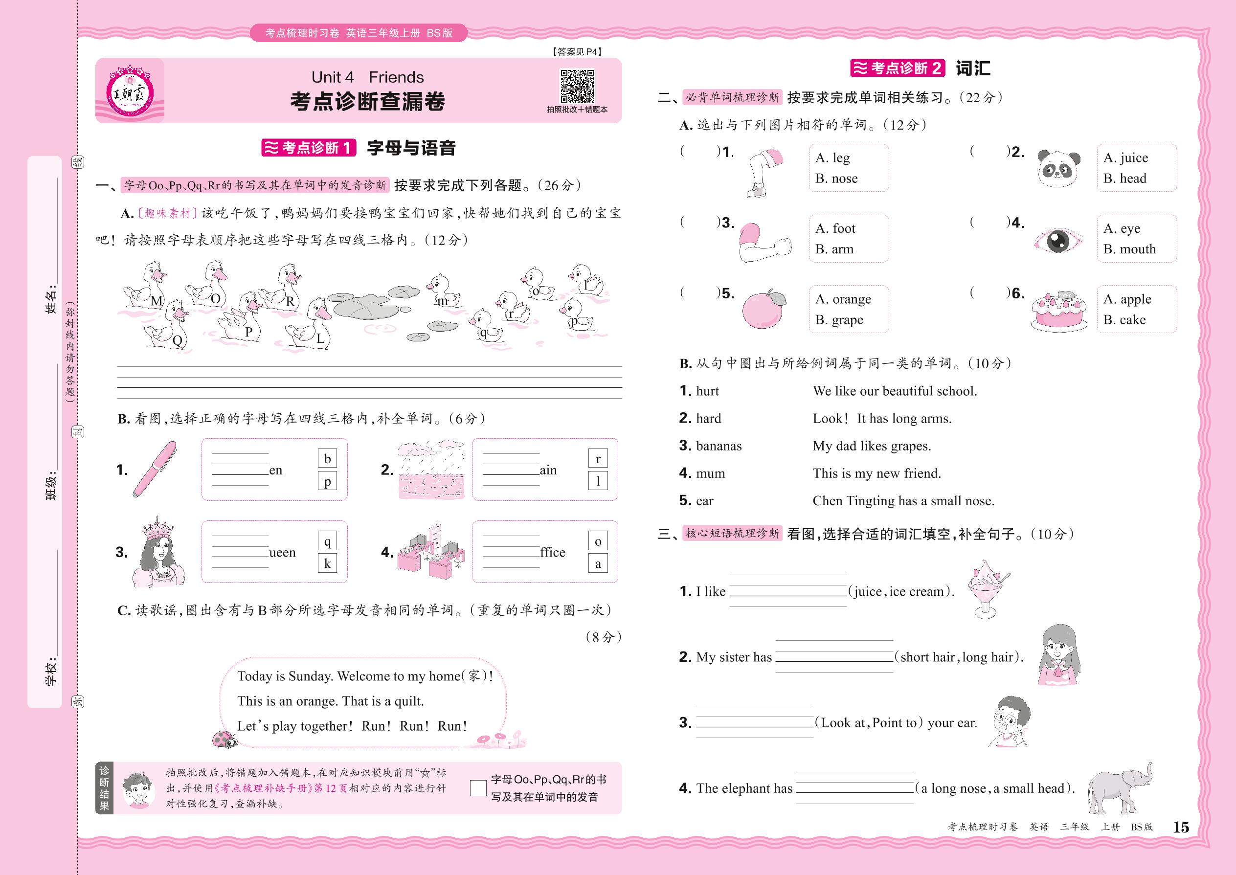2024秋上册三年级英语北师版 Unit 4 考点诊断查漏卷