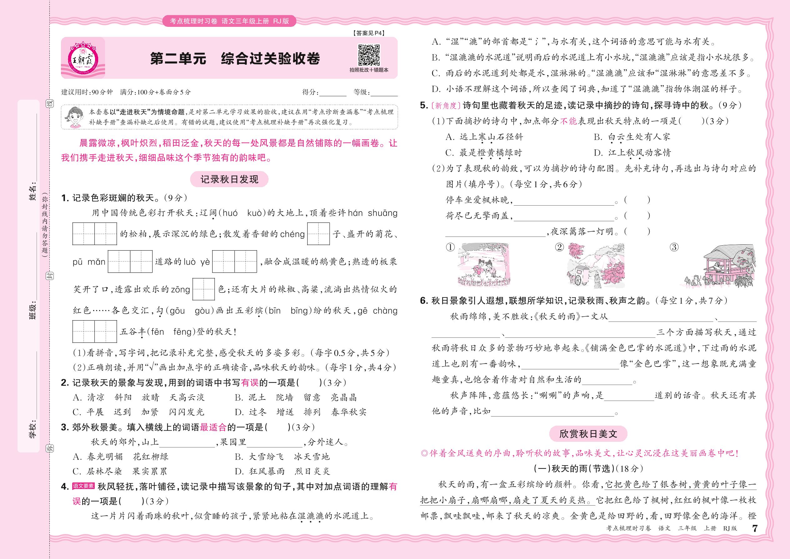 2024秋上册三年级语文人教版 第二单元 综合过关验收卷