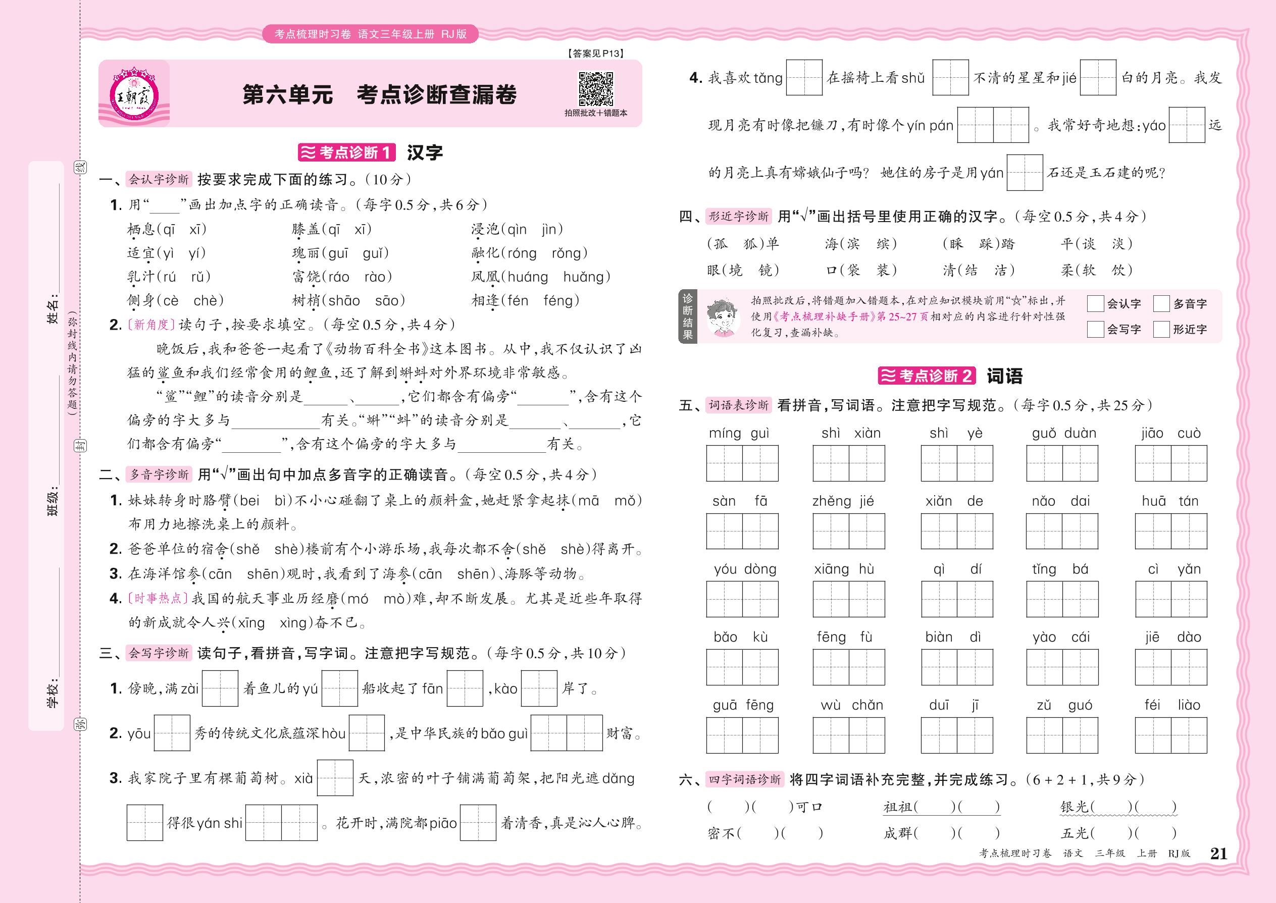 2024秋上册三年级语文人教版 第六单元 考点诊断查漏卷