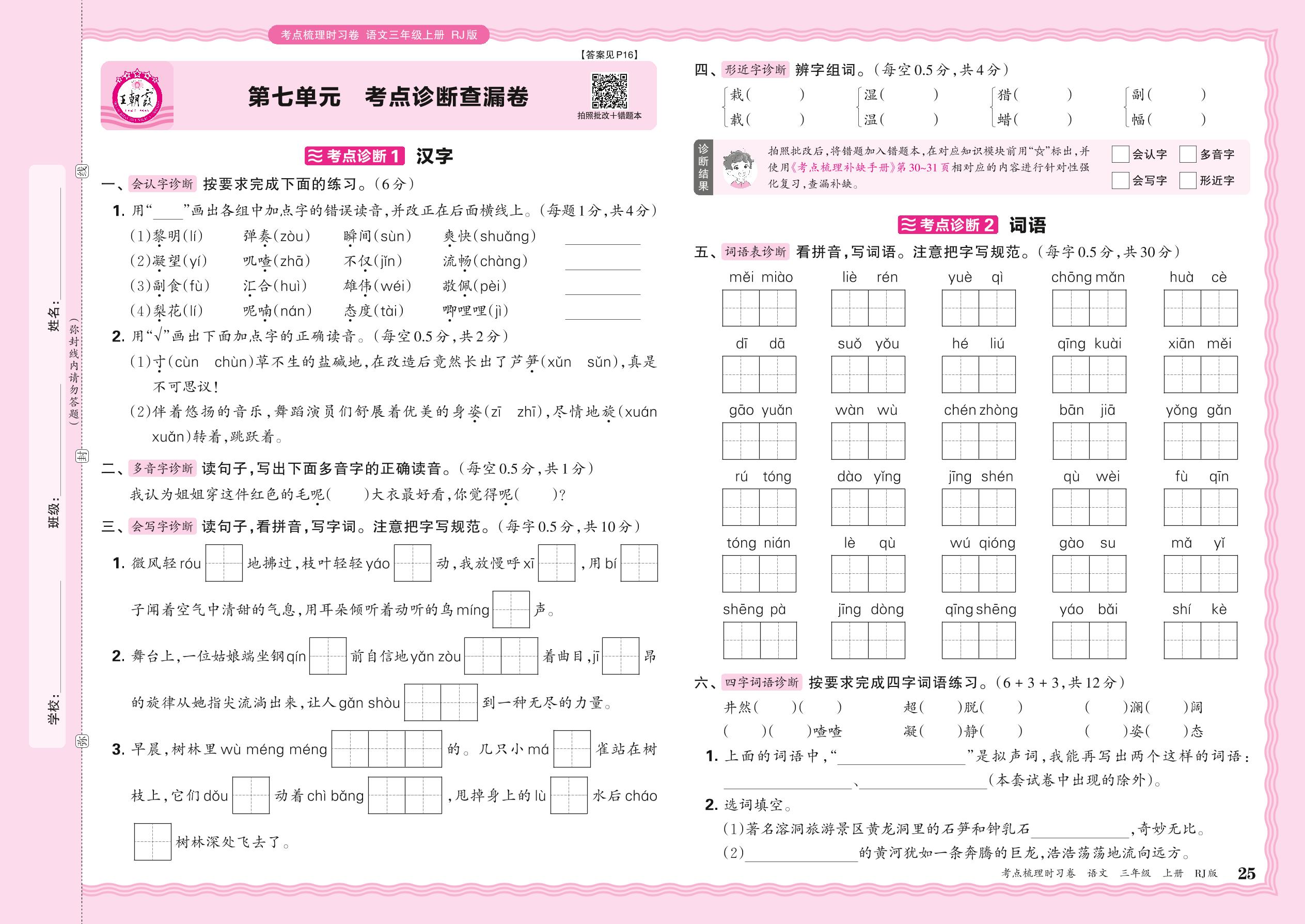 2024秋上册三年级语文人教版 第七单元 考点诊断查漏卷