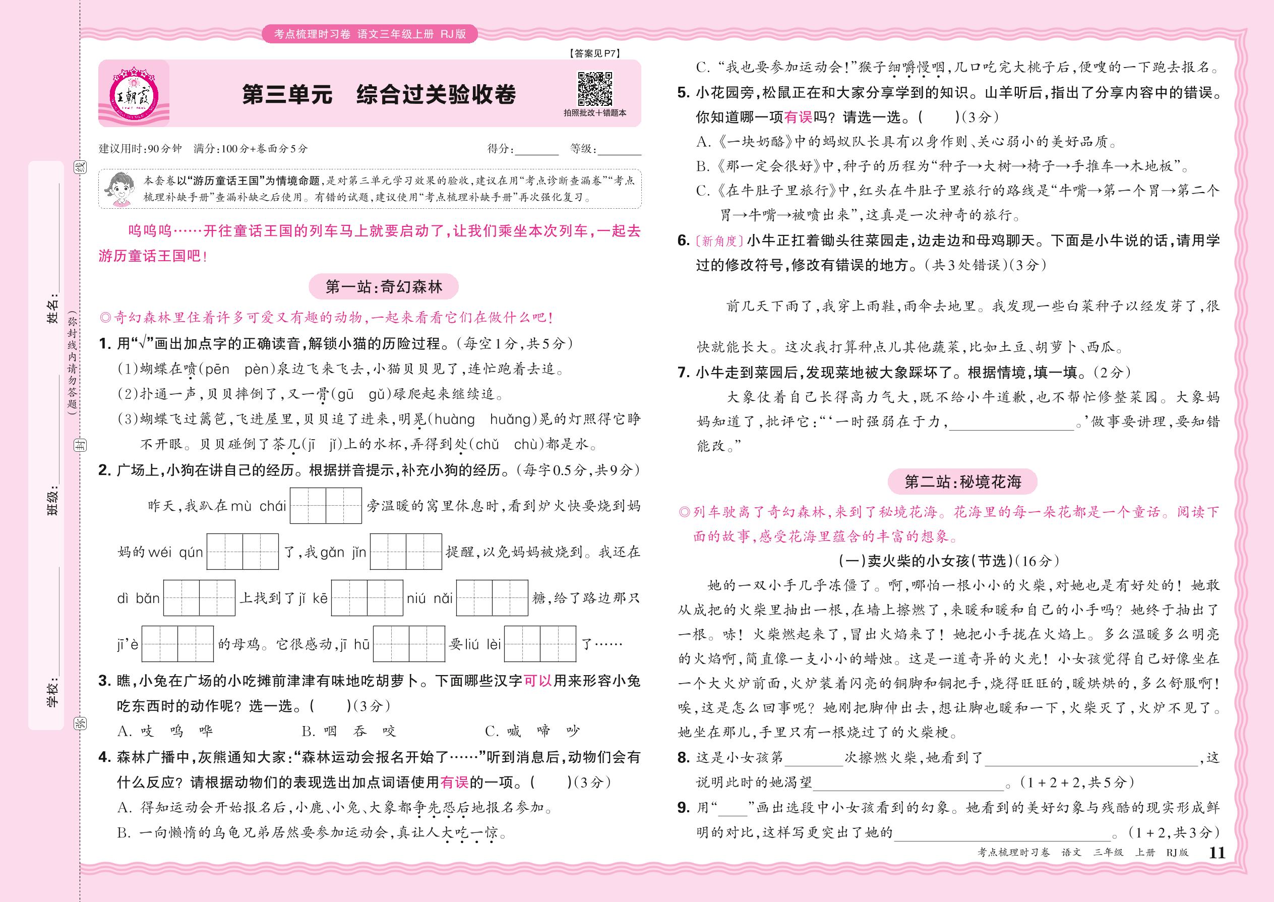 2024秋上册三年级语文人教版 第三单元 综合过关验收卷