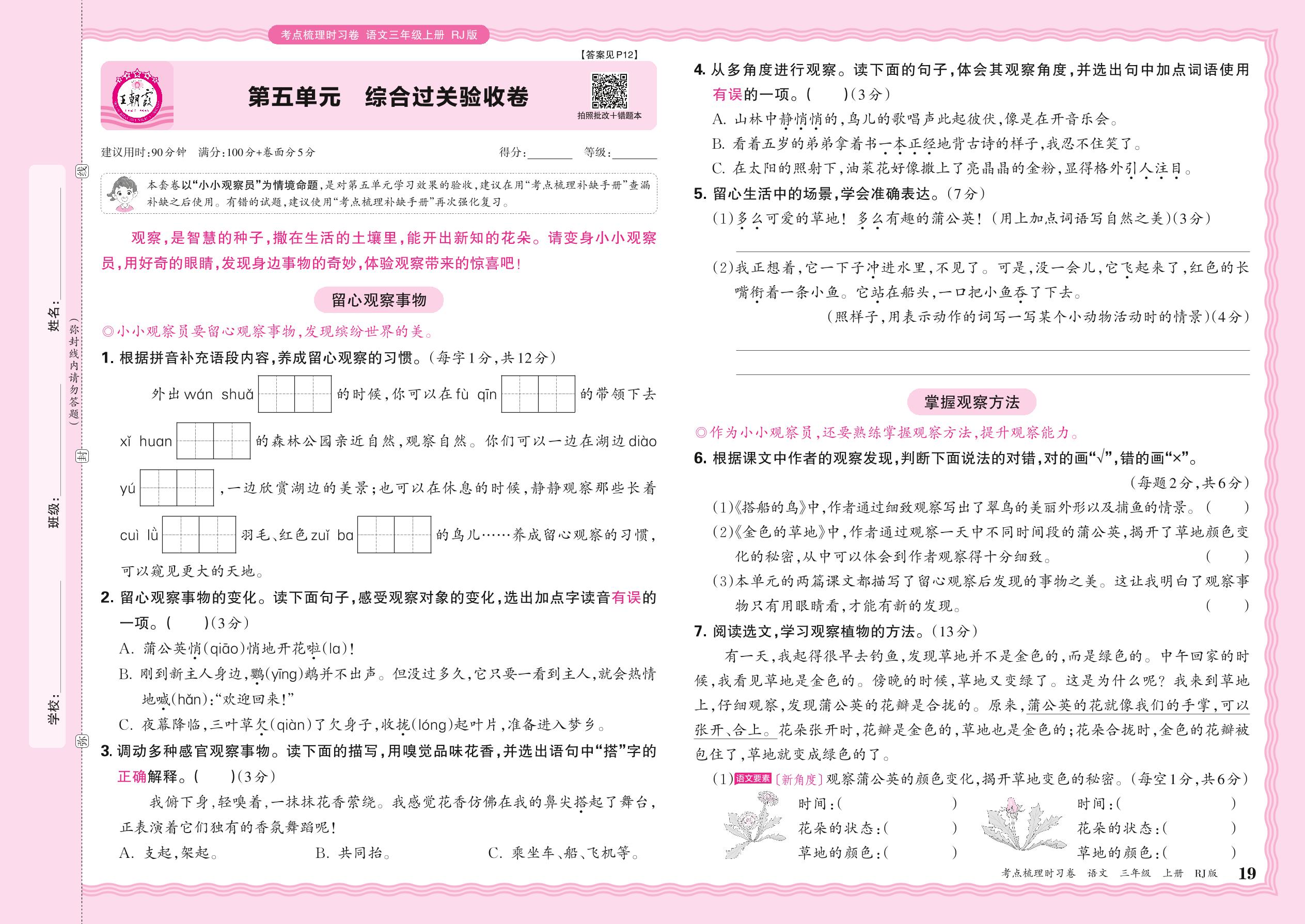 2024秋上册三年级语文人教版 第五单元 综合过关验收卷