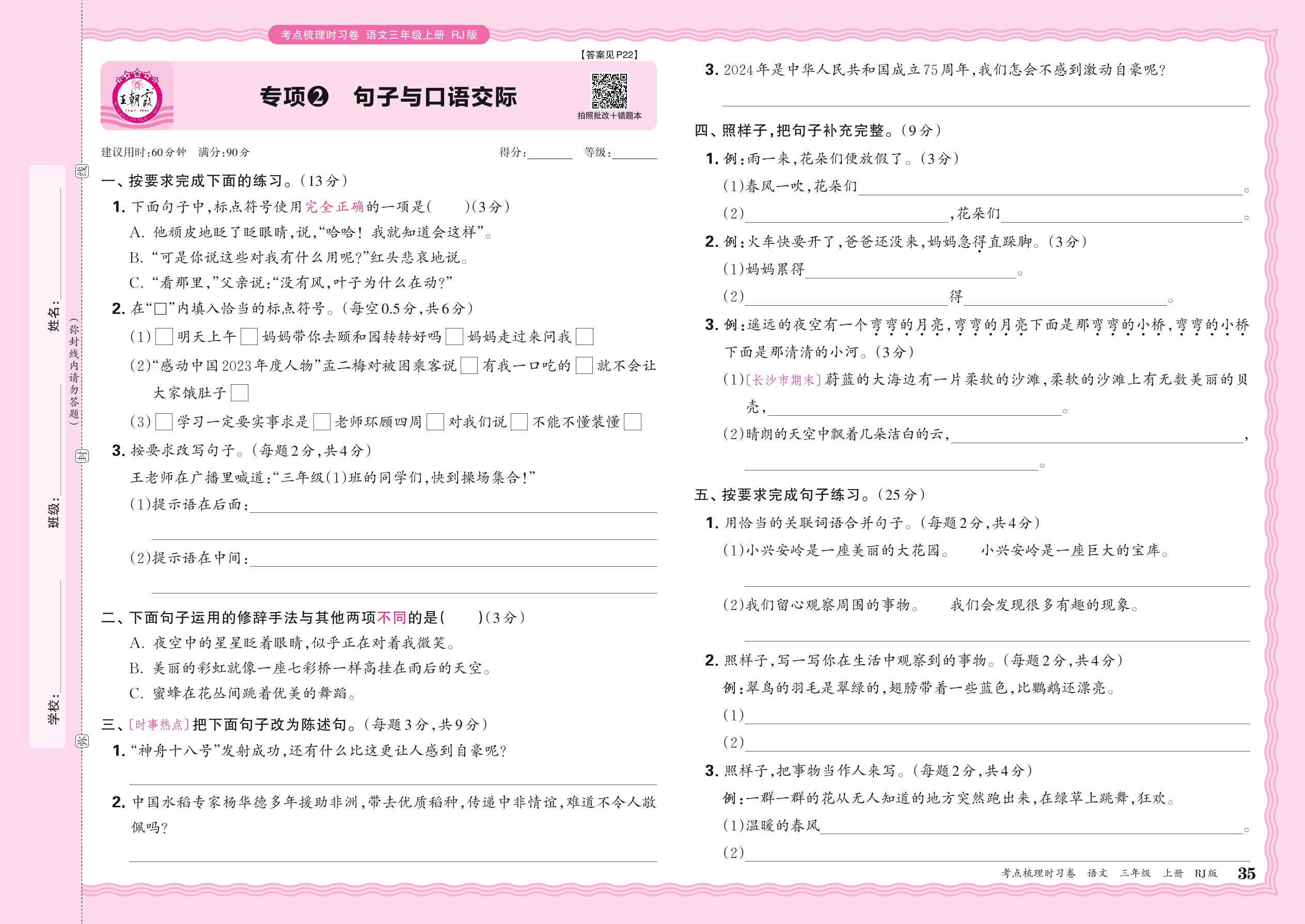 2024秋上册三年级语文人教版 期末专项卷KD版·句子与口语交际【2】