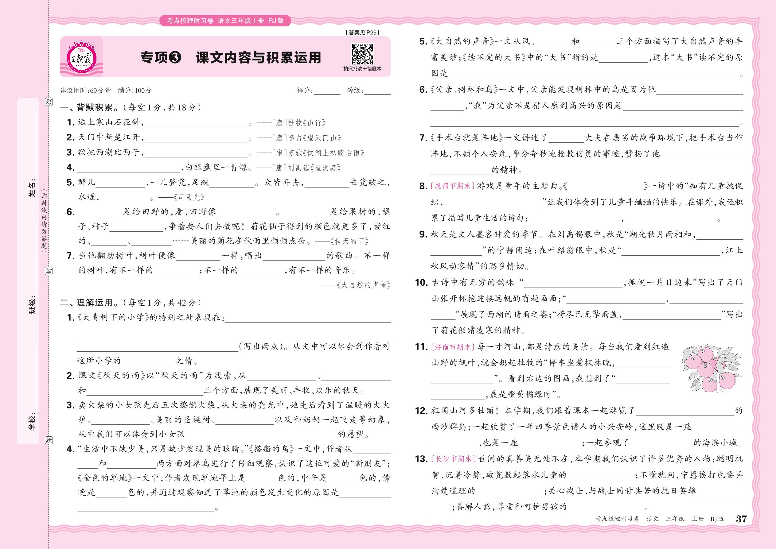 2024秋上册三年级语文人教版 期末专项卷KD版·课文内容与积累运用【3】
