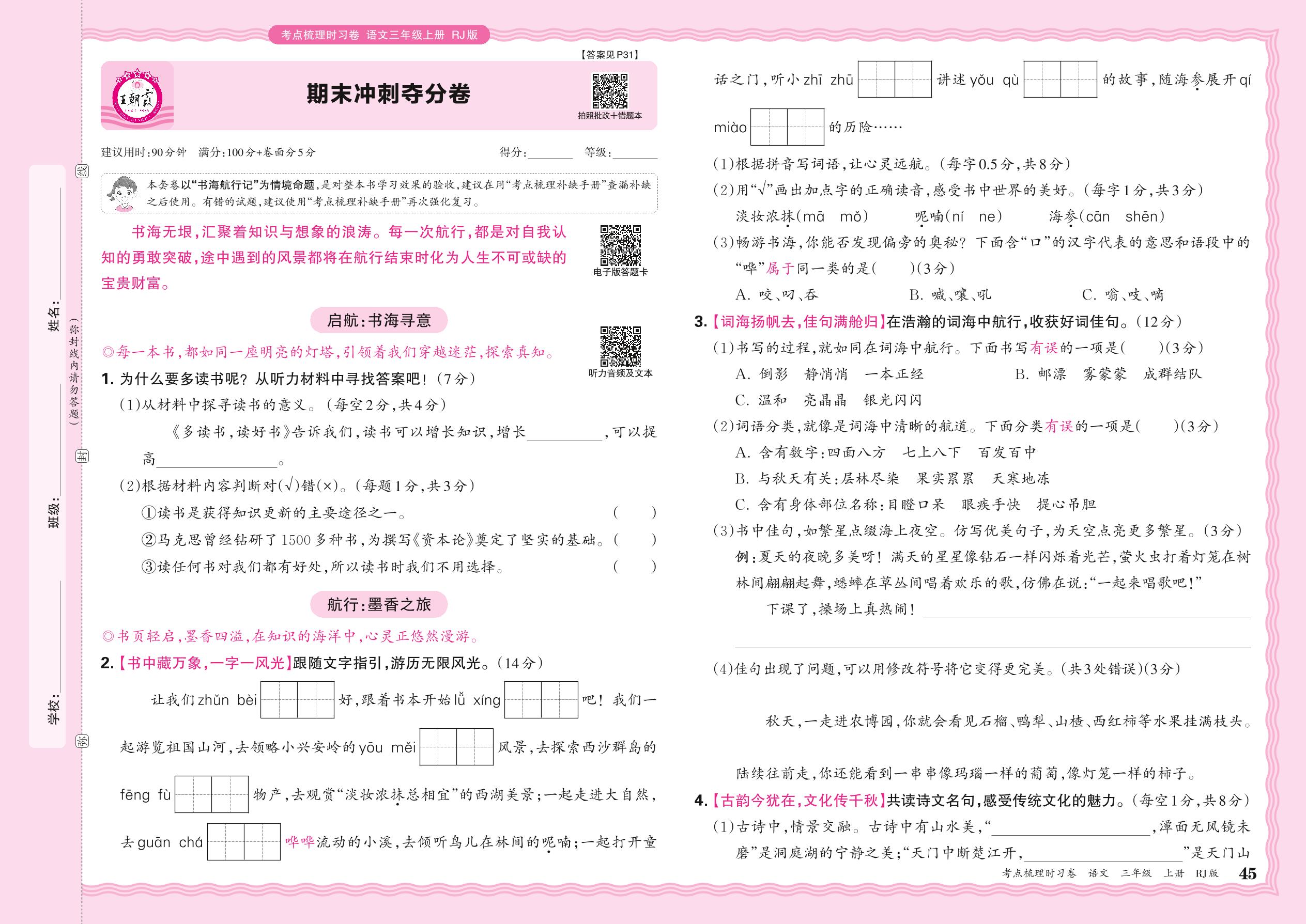 2024秋上册三年级语文人教版 期末冲刺夺分卷