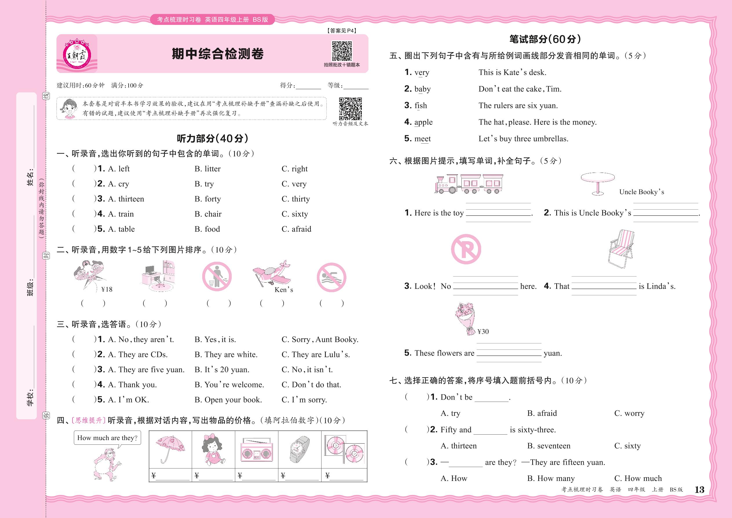 2024秋上册四年级英语北师版 期中综合检测卷