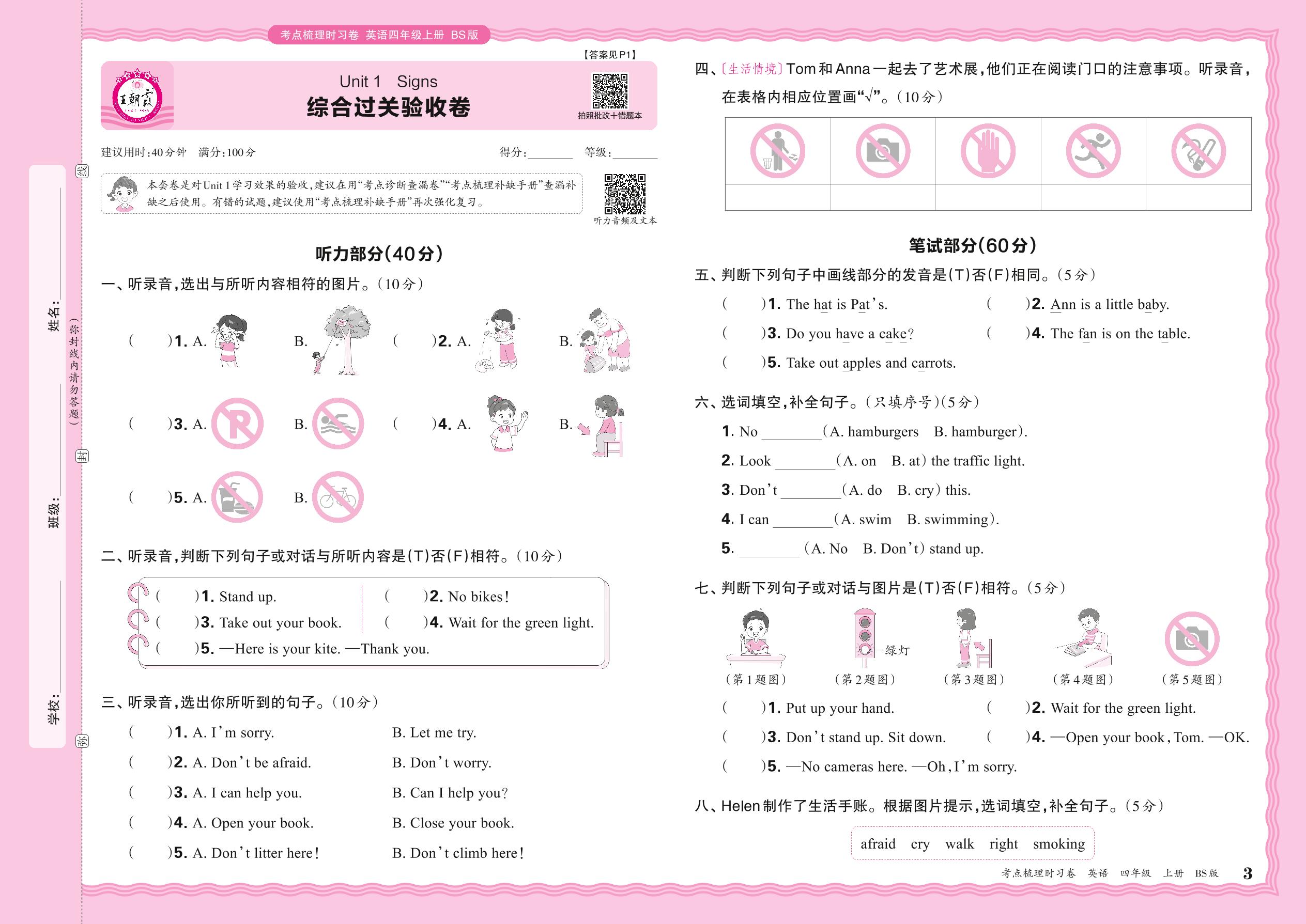 2024秋上册四年级英语北师版 Unit 1 综合过关验收卷