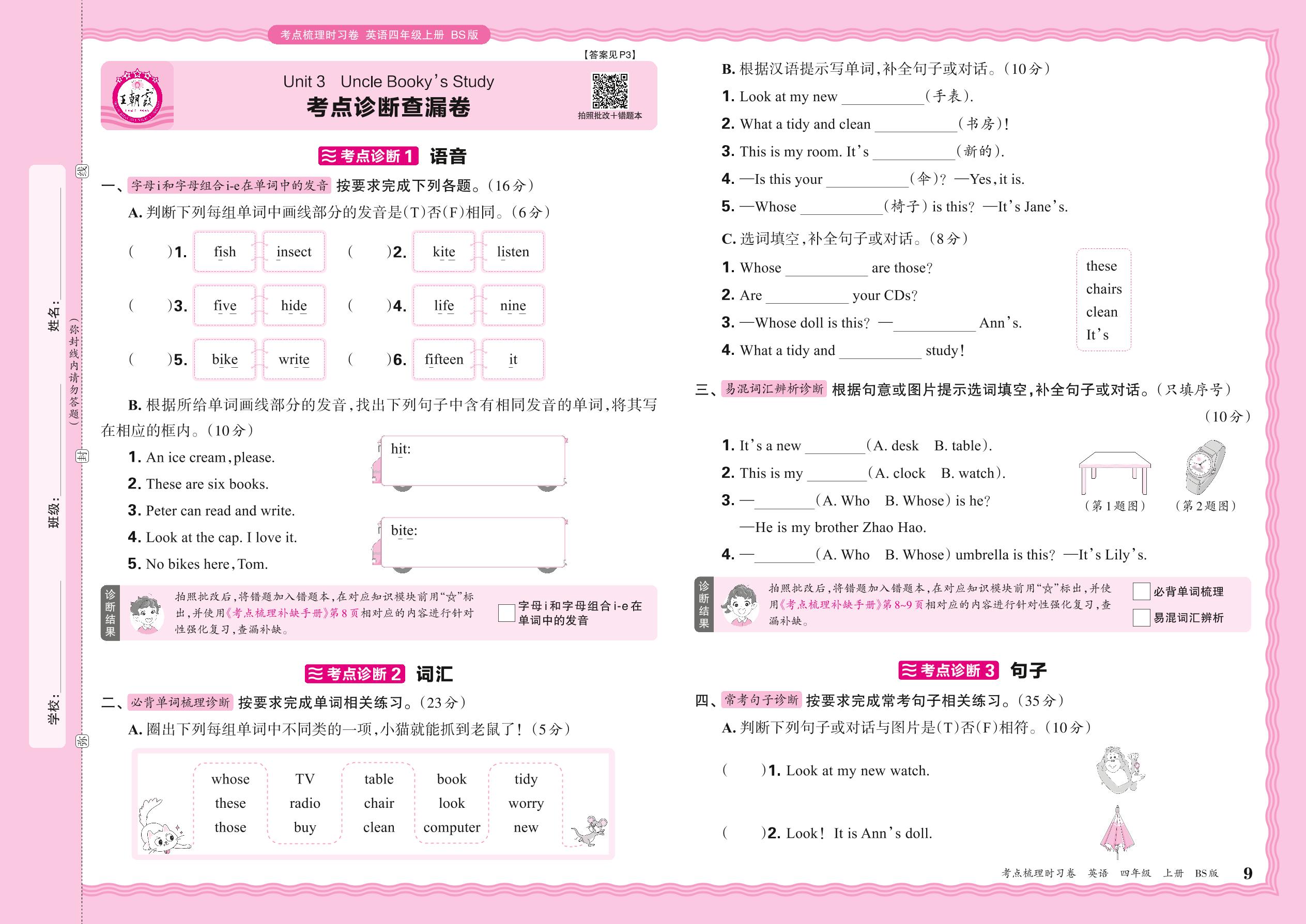 2024秋上册四年级英语北师版 Unit 3 考点诊断查漏卷