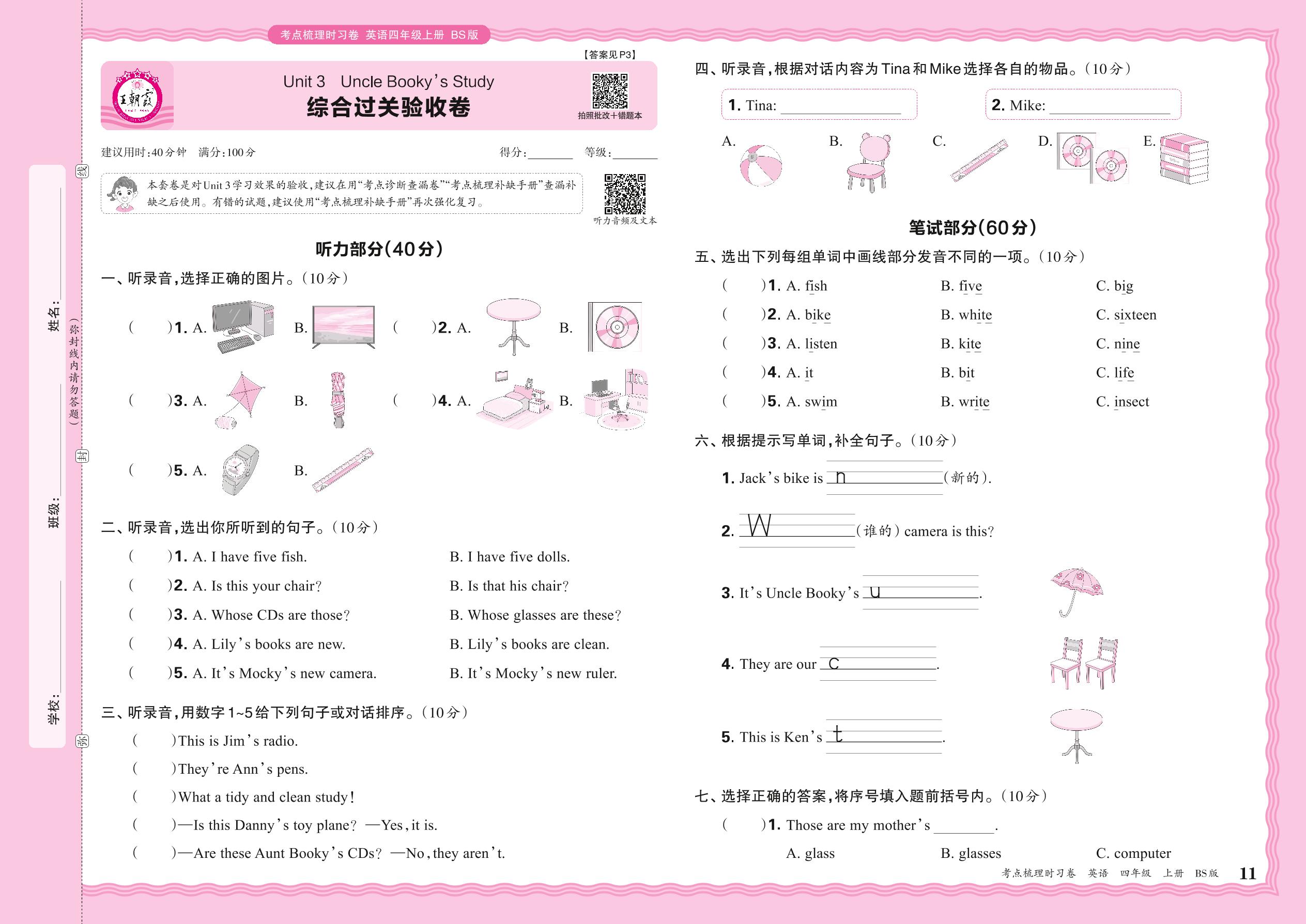 2024秋上册四年级英语北师版 Unit 3 综合过关验收卷