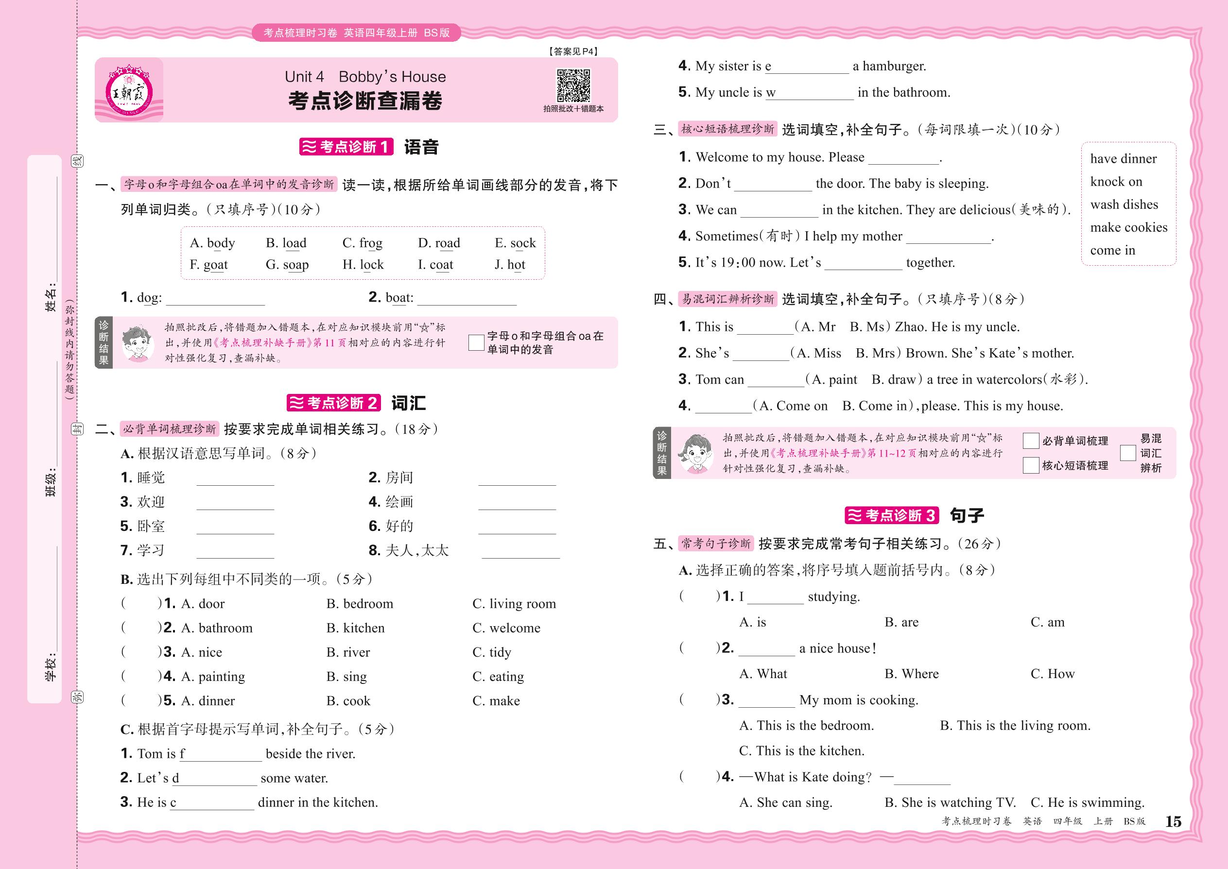 2024秋上册四年级英语北师版 Unit 4 考点诊断查漏卷