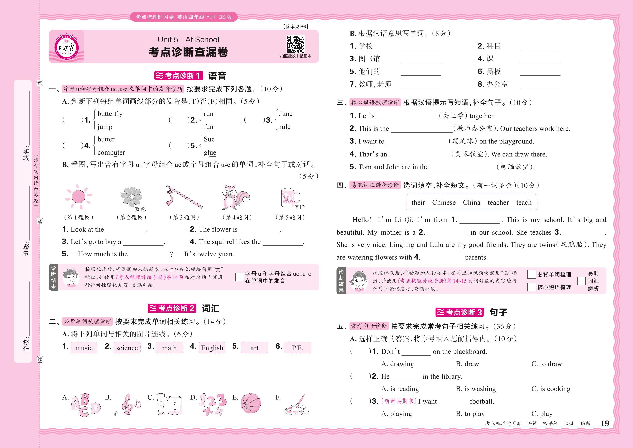 2024秋上册四年级英语北师版 Unit 5 考点诊断查漏卷