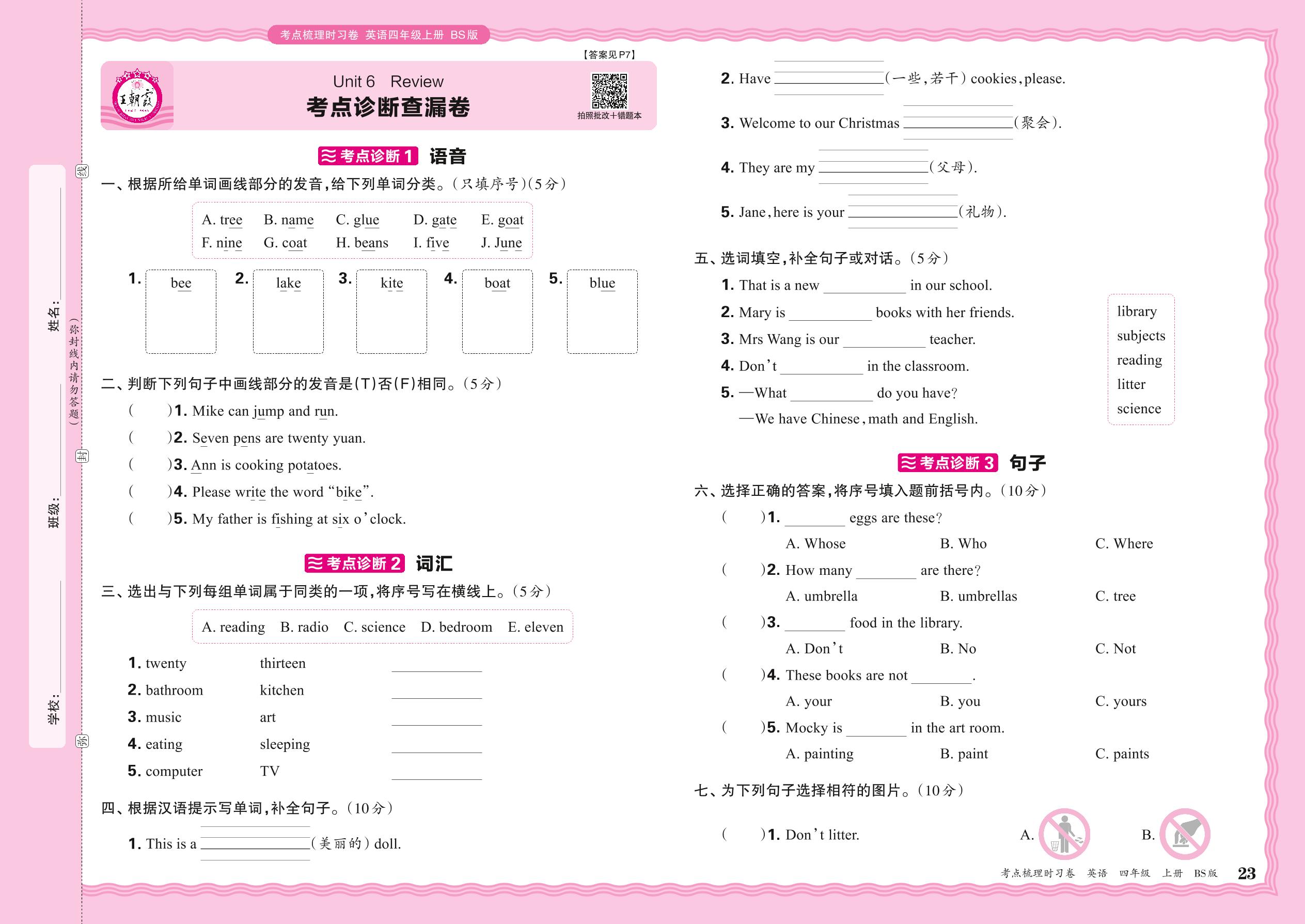 2024秋上册四年级英语北师版 Unit 6 考点诊断查漏卷