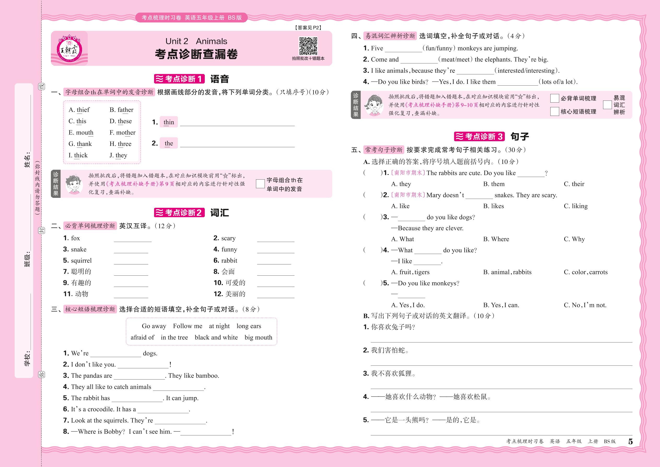 2024秋上册五年级英语北师版 Unit 2 考点诊断查漏卷