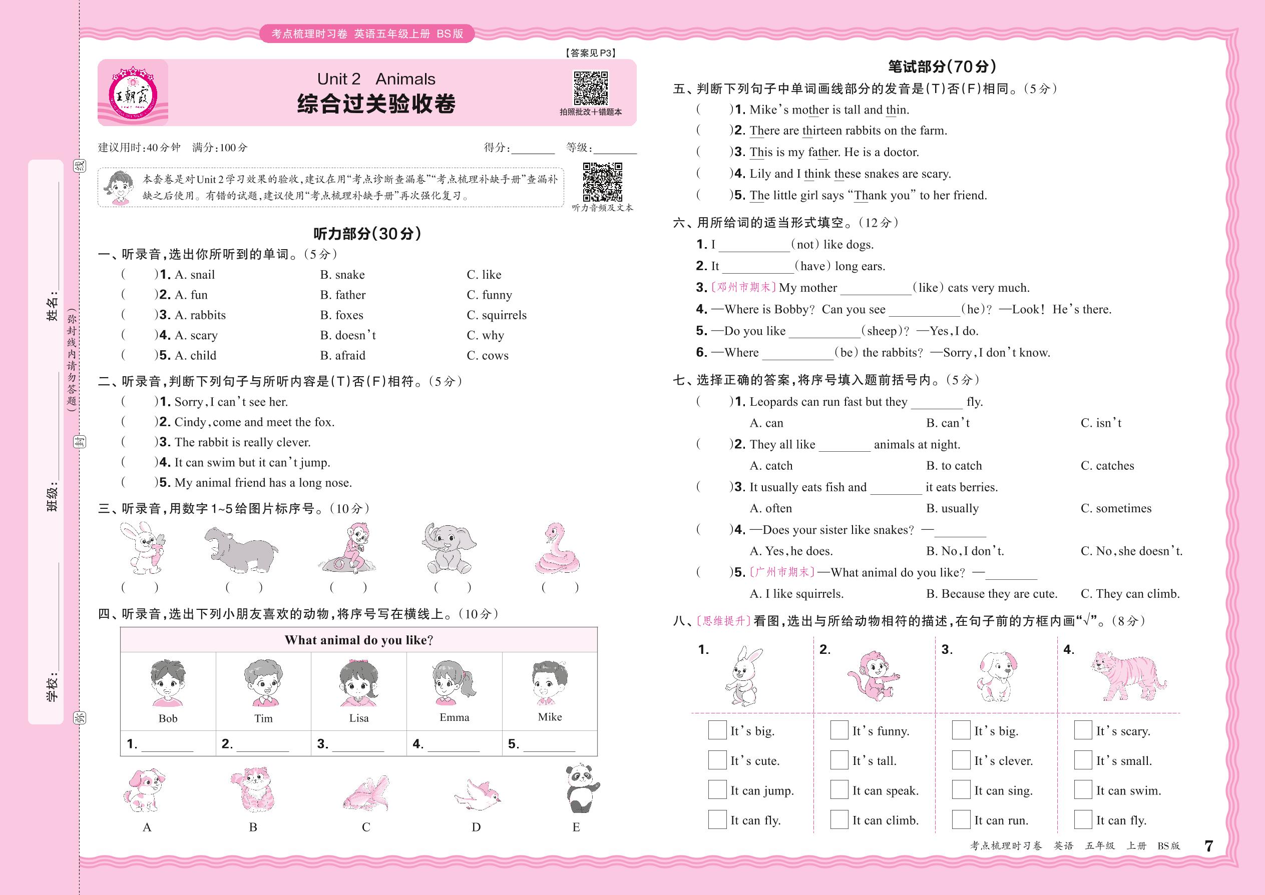 2024秋上册五年级英语北师版 Unit 2 综合过关验收卷