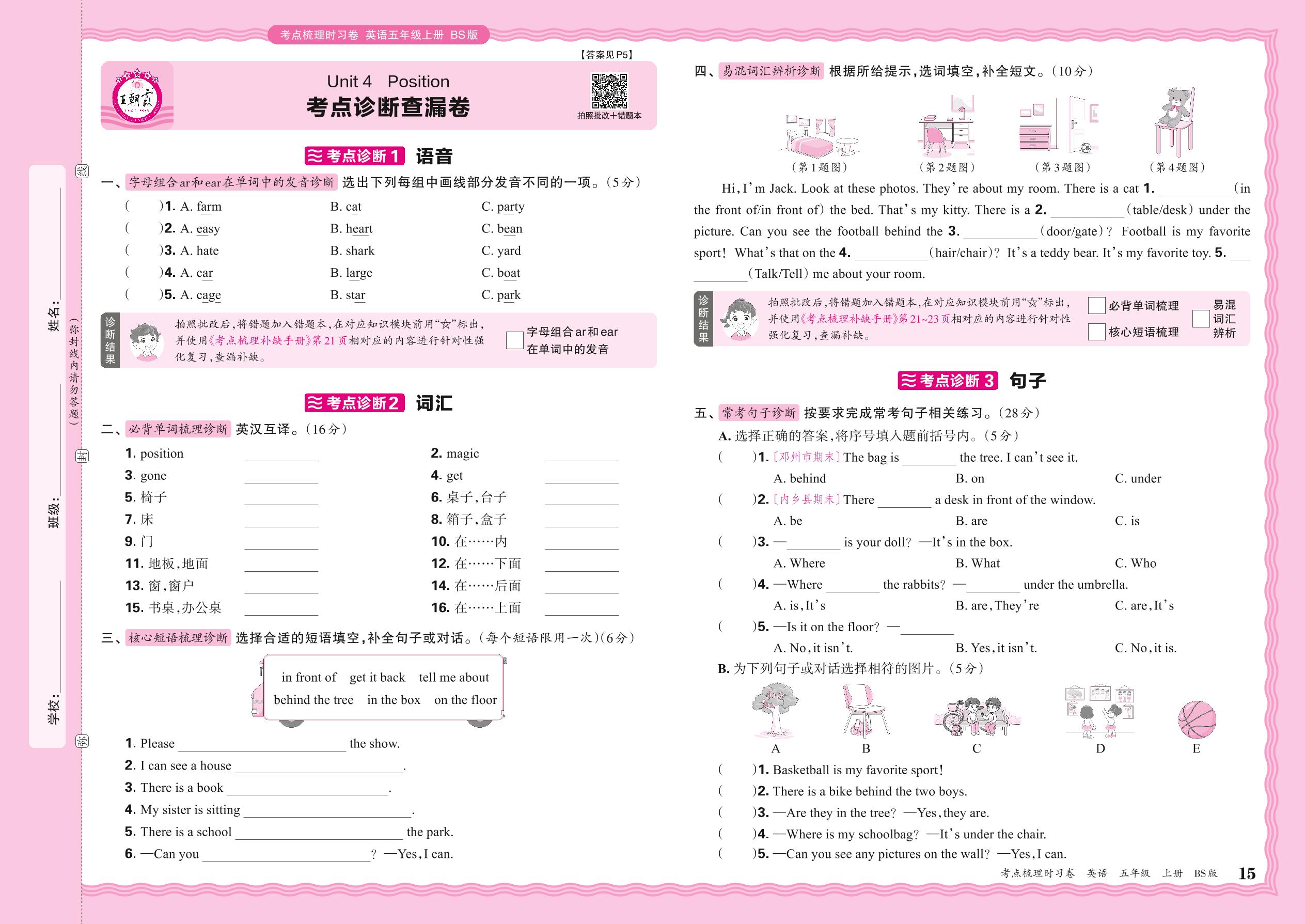 2024秋上册五年级英语北师版 Unit 4 考点诊断查漏卷