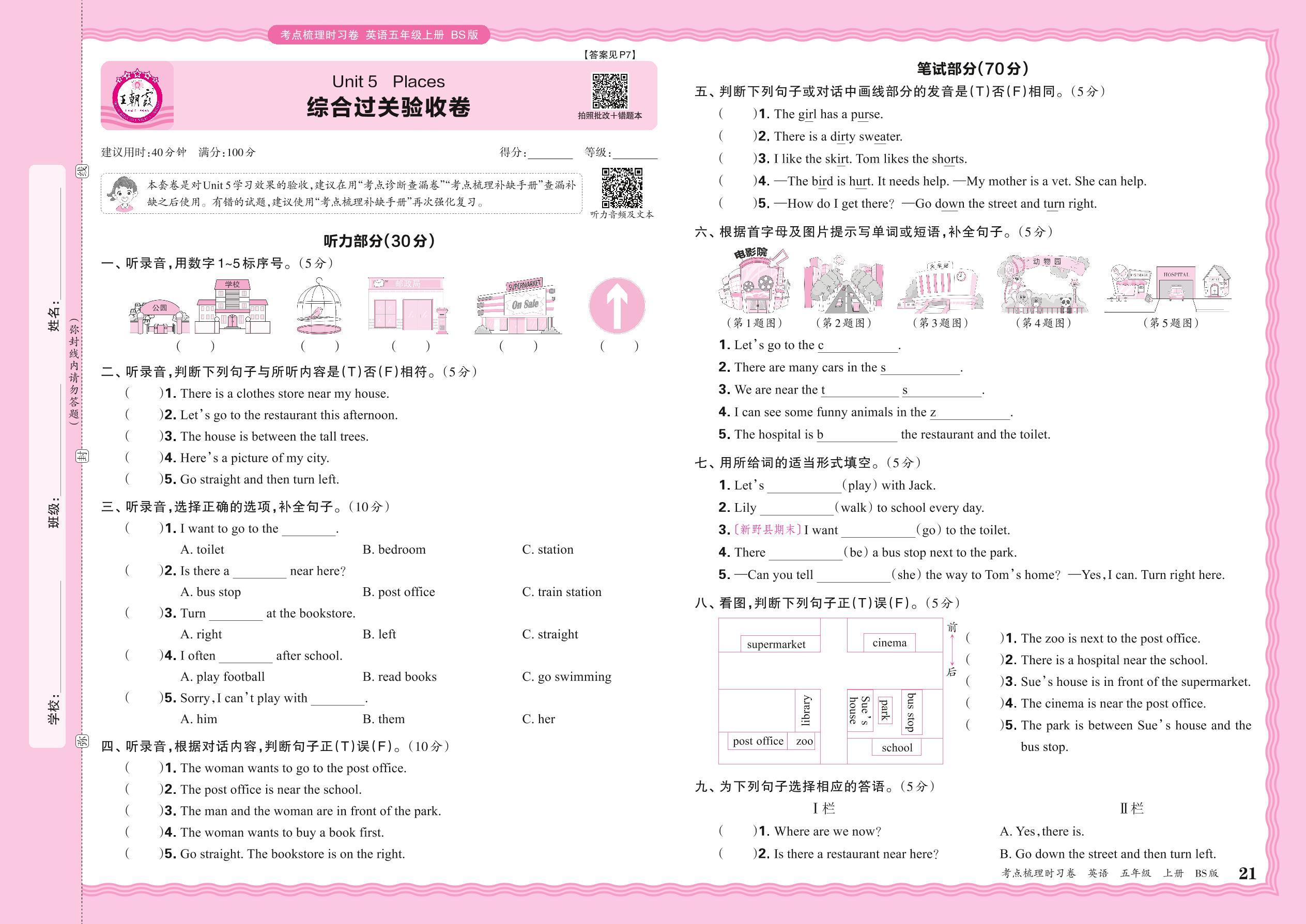 2024秋上册五年级英语北师版 Unit 5 综合过关验收卷