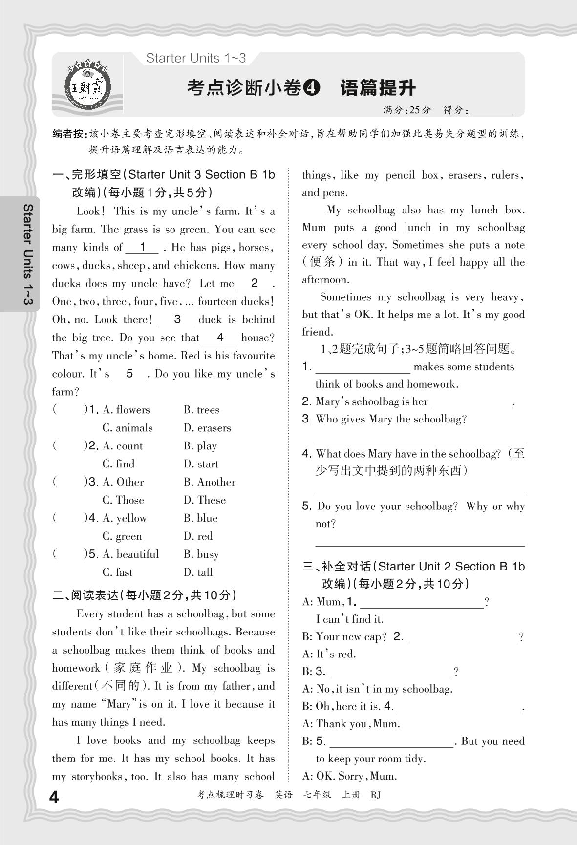 2024秋上册七年级英语人教版 Starter Units 1~3 考点诊断小卷4 语篇提升