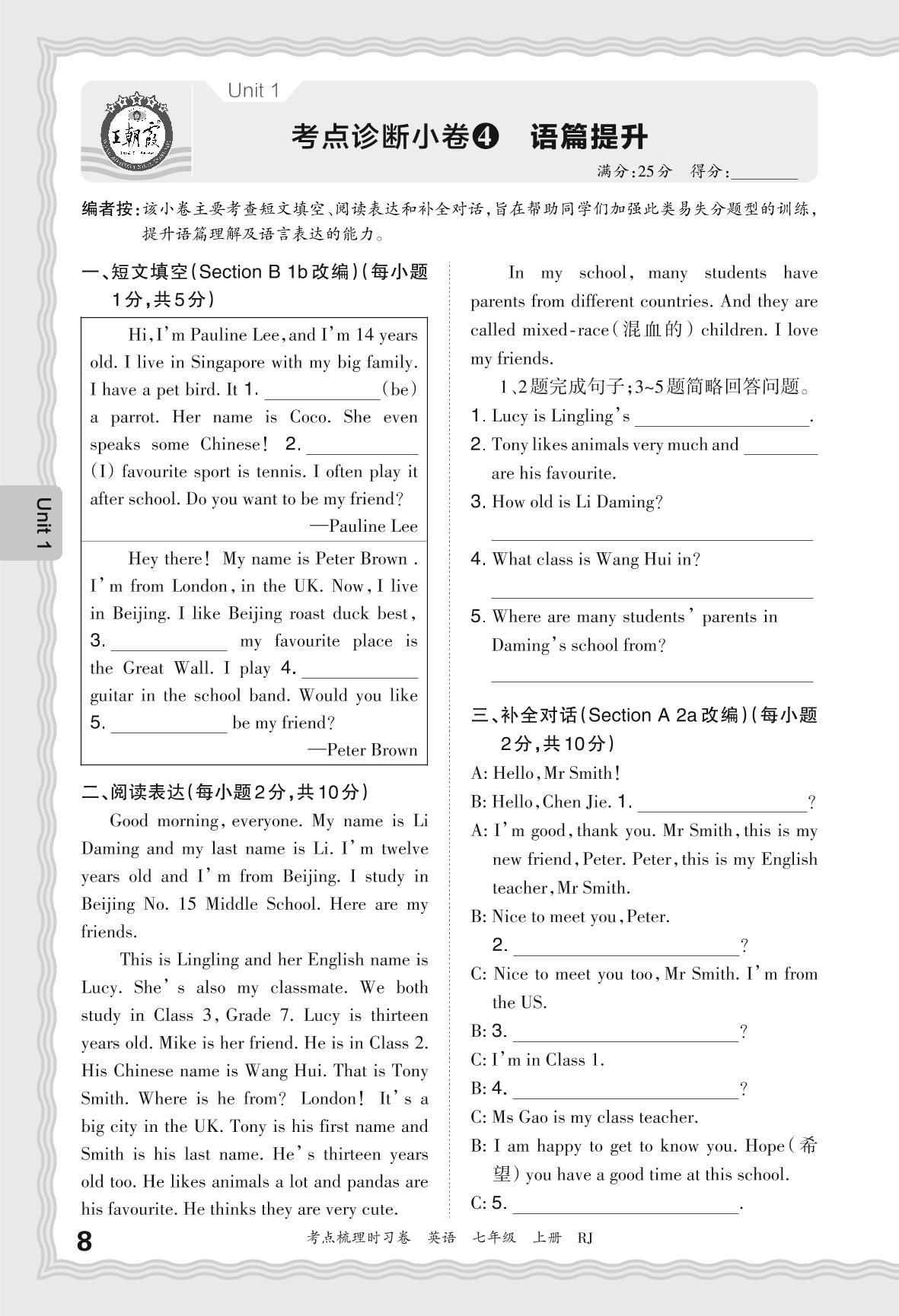 2024秋上册七年级英语人教版 Unit 1 考点诊断小卷4 语篇提升_R240827094831179