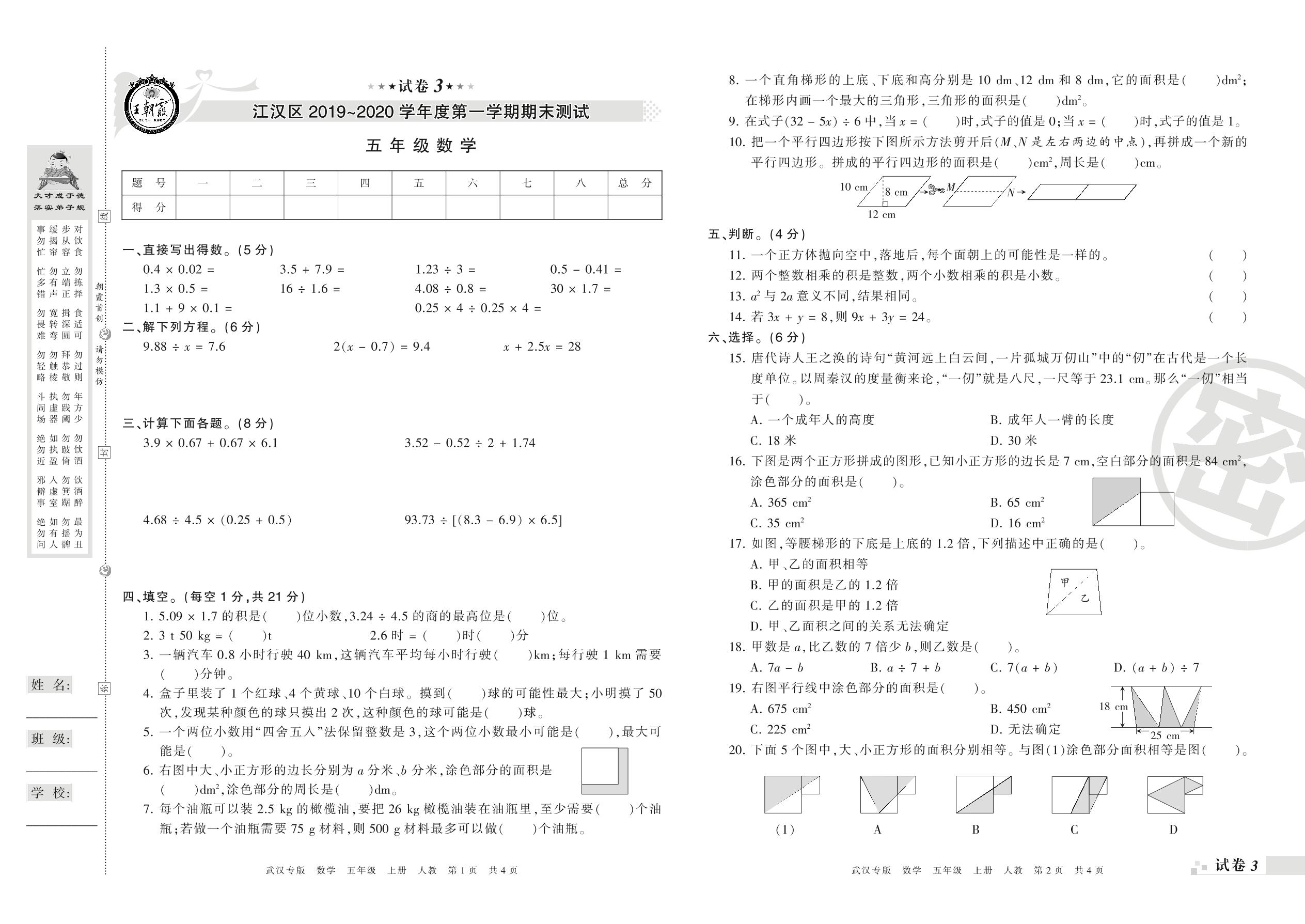 2019-2020学年第一学期武汉市江汉区五年级数学试卷(人教版)【3】