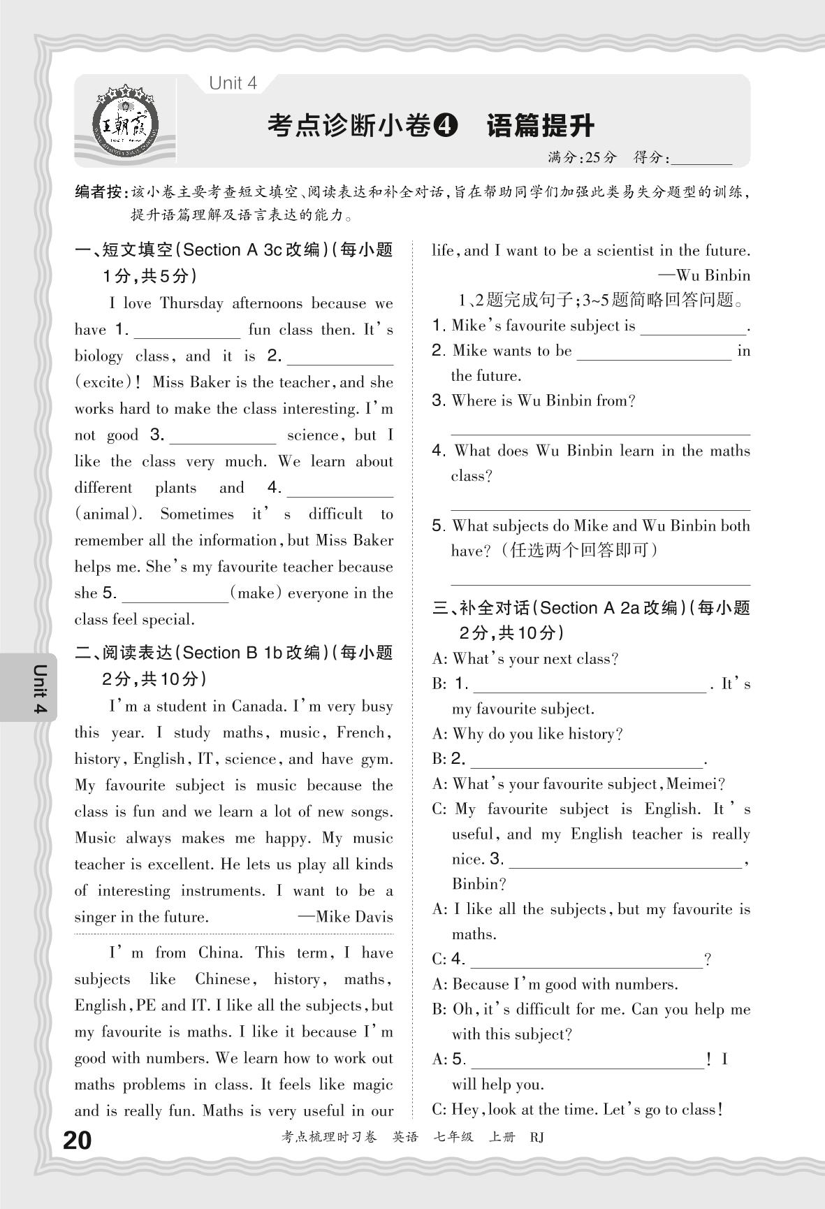 2024秋上册七年级英语人教版 Unit 4 考点诊断小卷4 语篇提升_R240827094836937