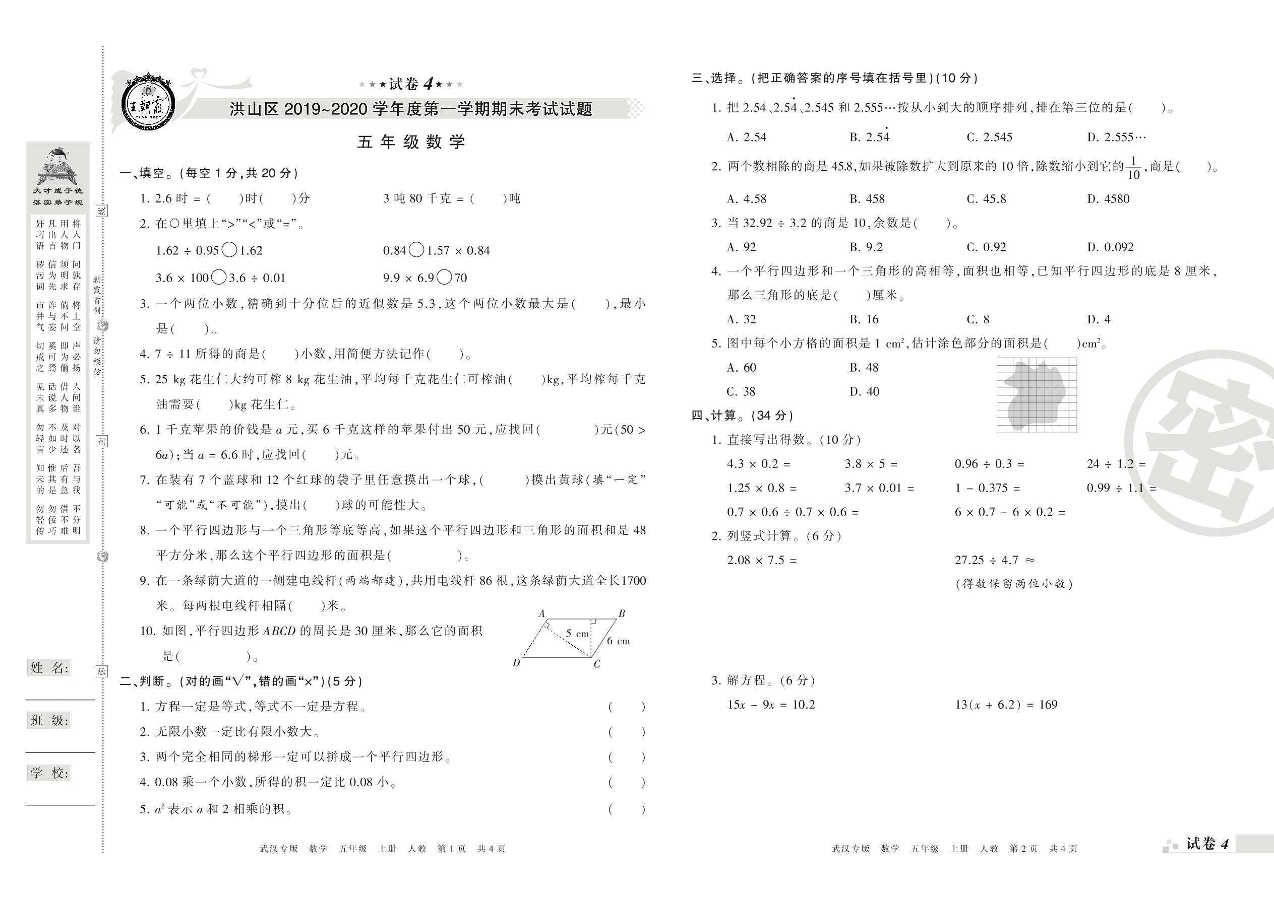 2019-2020学年第一学期武汉市洪山区五年级数学试卷(人教版)【4】