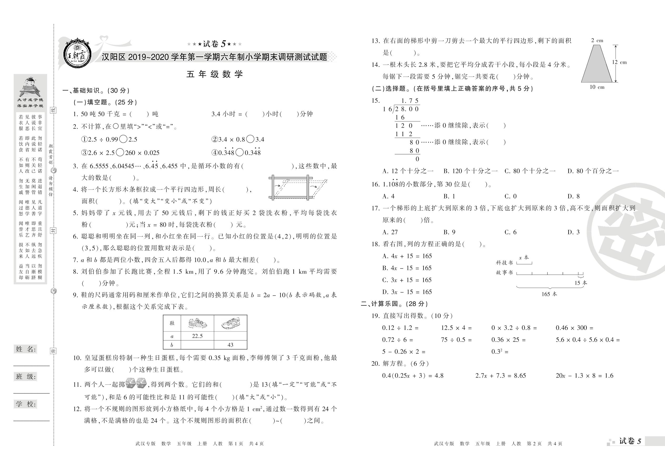 2019-2020学年第一学期武汉市汉阳区五年级数学试卷(人教版)【5】