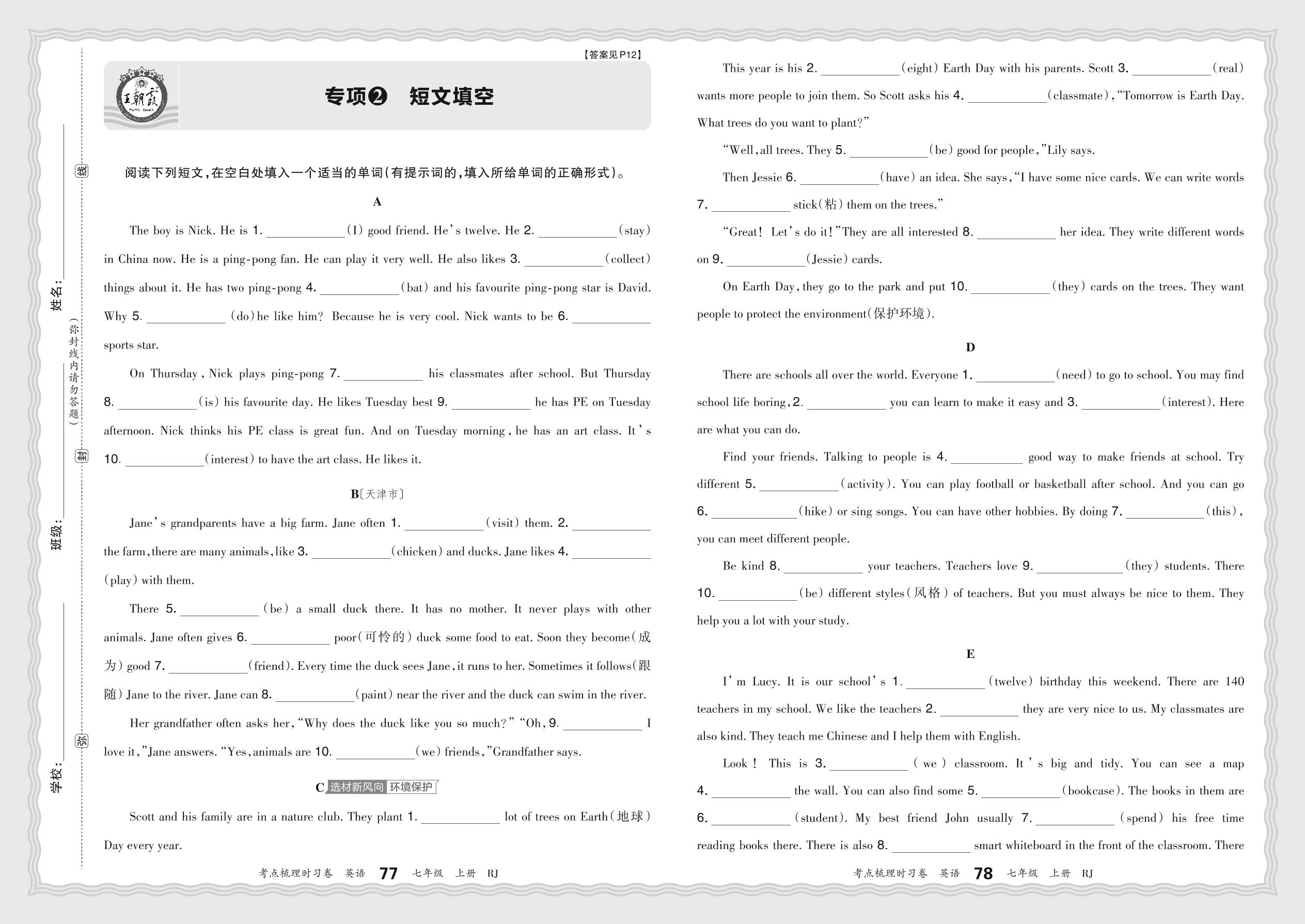 2024秋上册七年级英语人教版 期末专项卷KD版·短文填空【2】