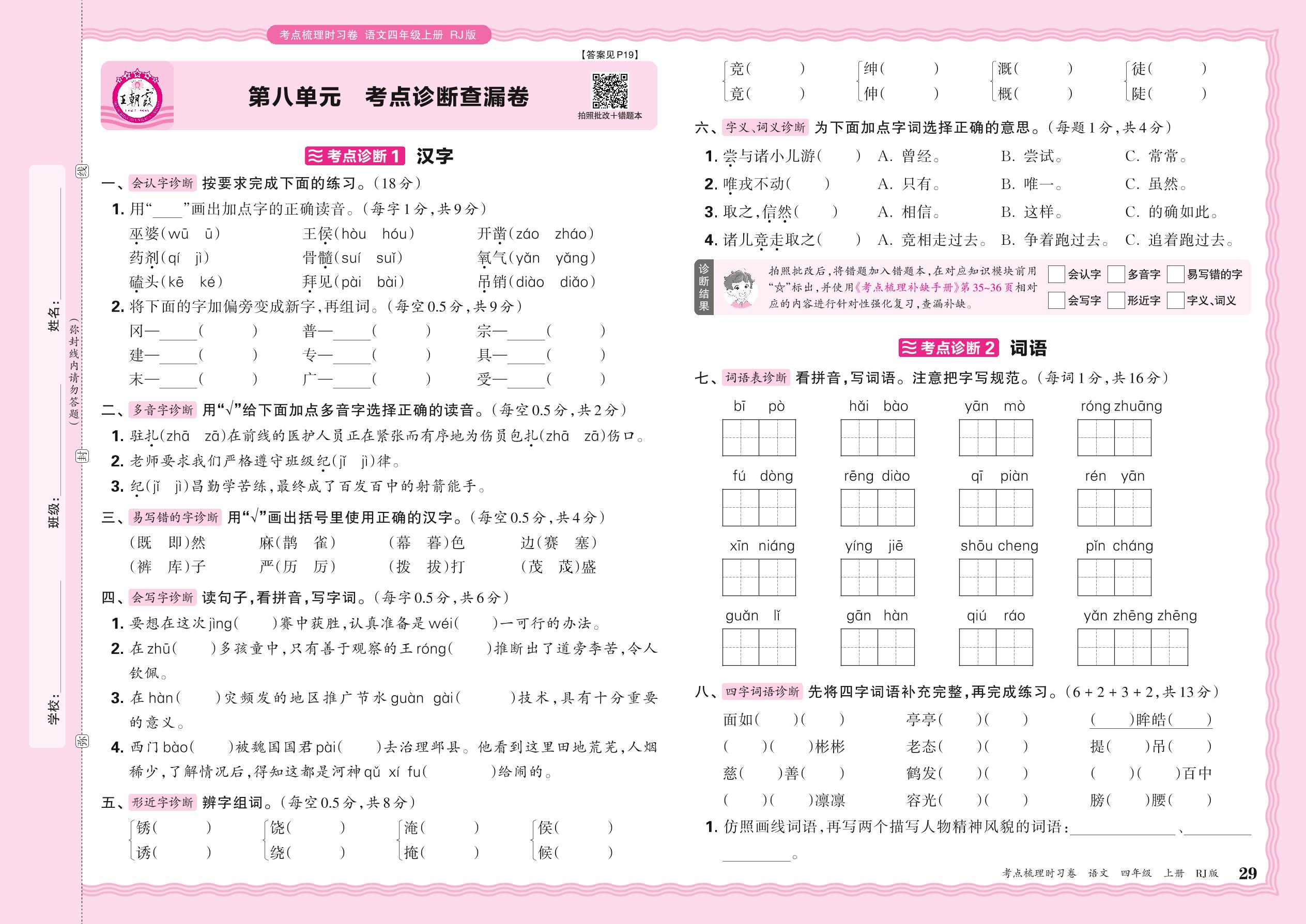 2024秋上册四年级语文人教版 第八单元 考点诊断查漏卷