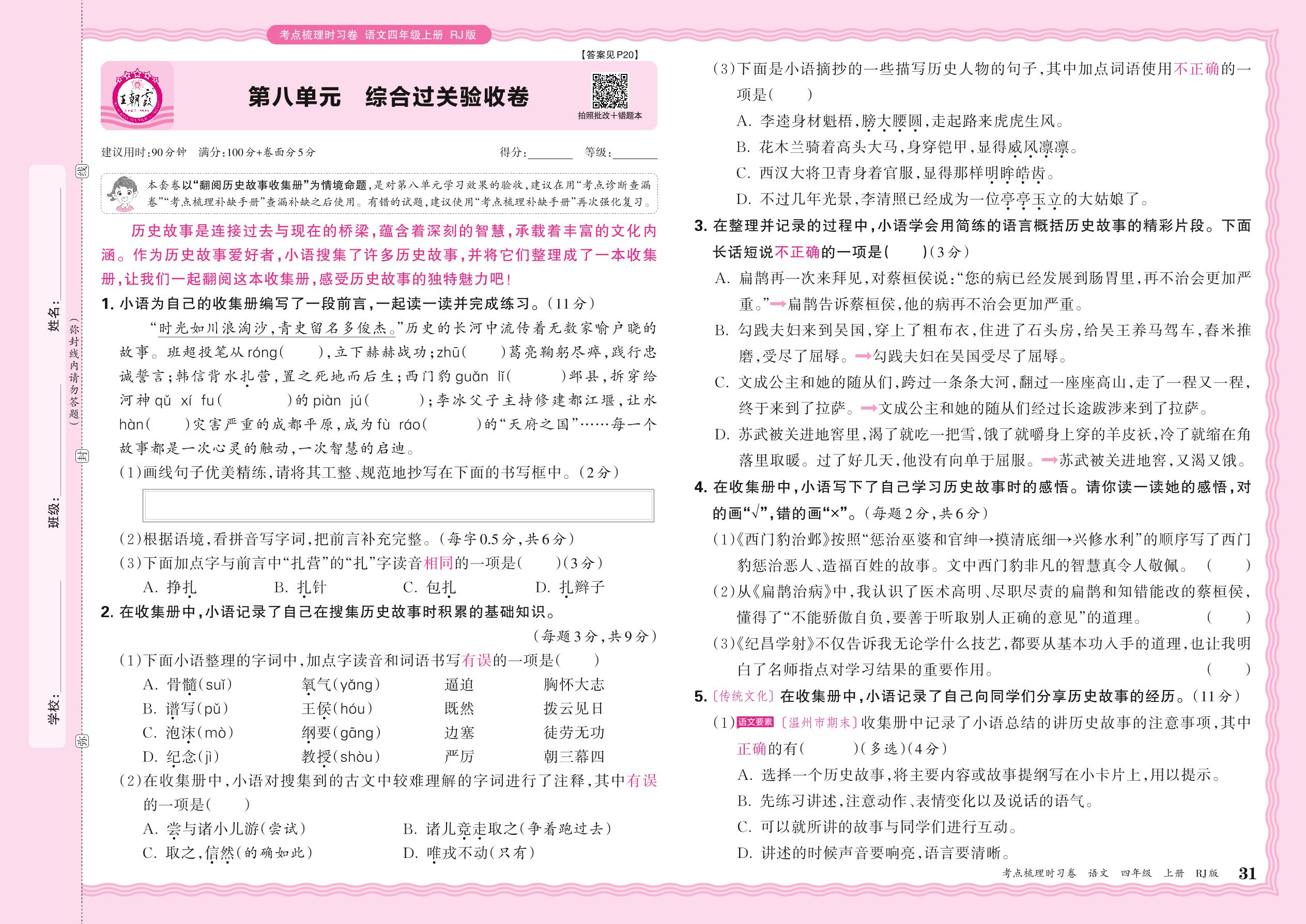 2024秋上册四年级语文人教版 第八单元 综合过关验收卷