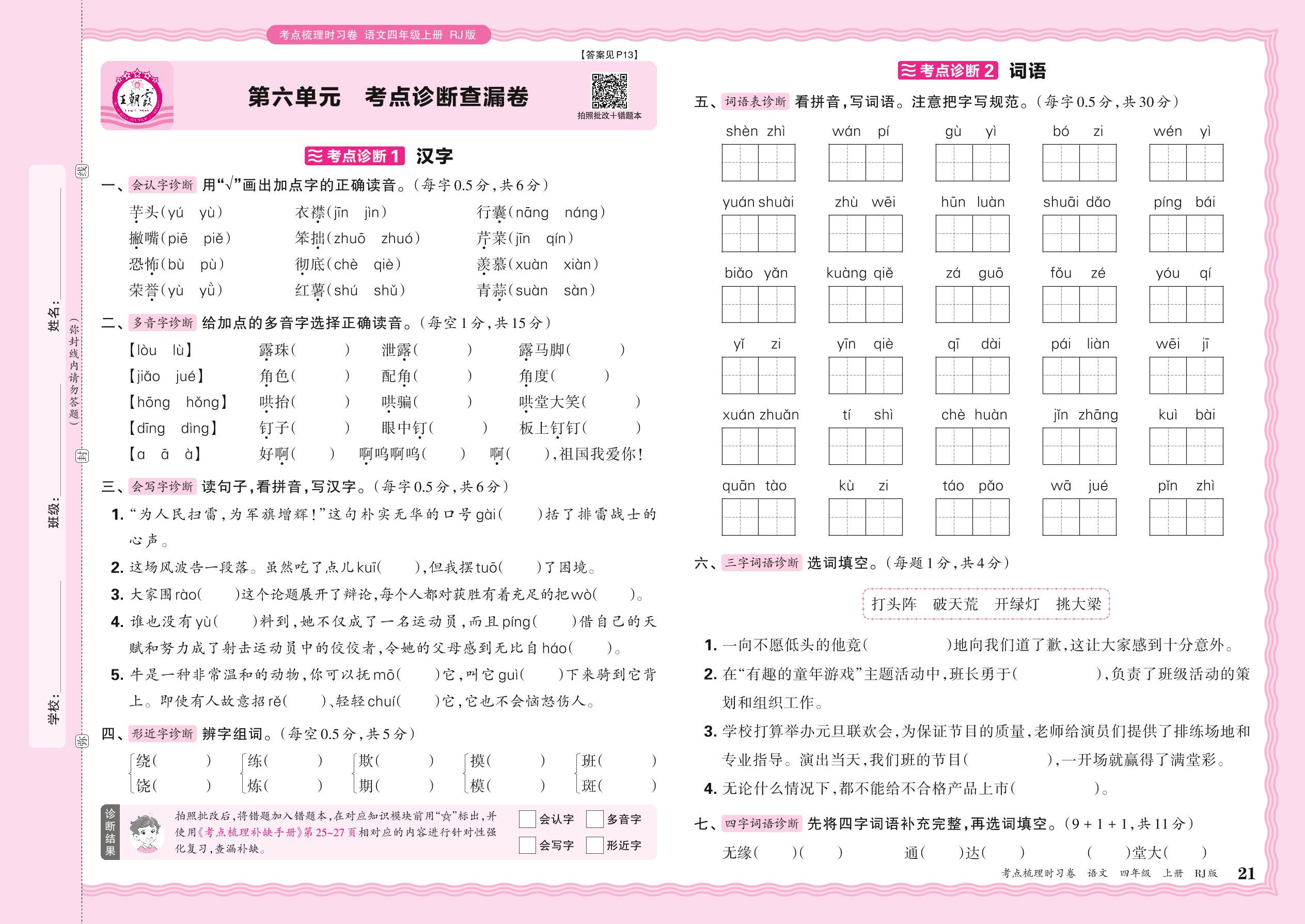 2024秋上册四年级语文人教版 第六单元 考点诊断查漏卷