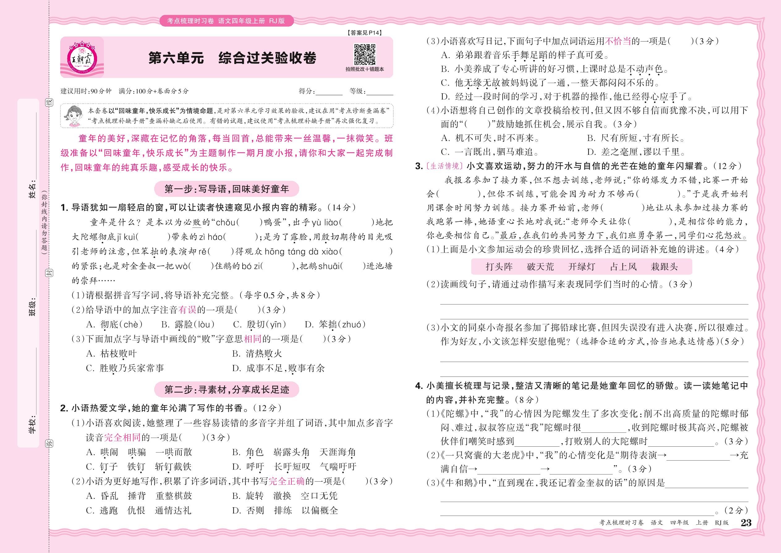 2024秋上册四年级语文人教版 第六单元 综合过关验收卷