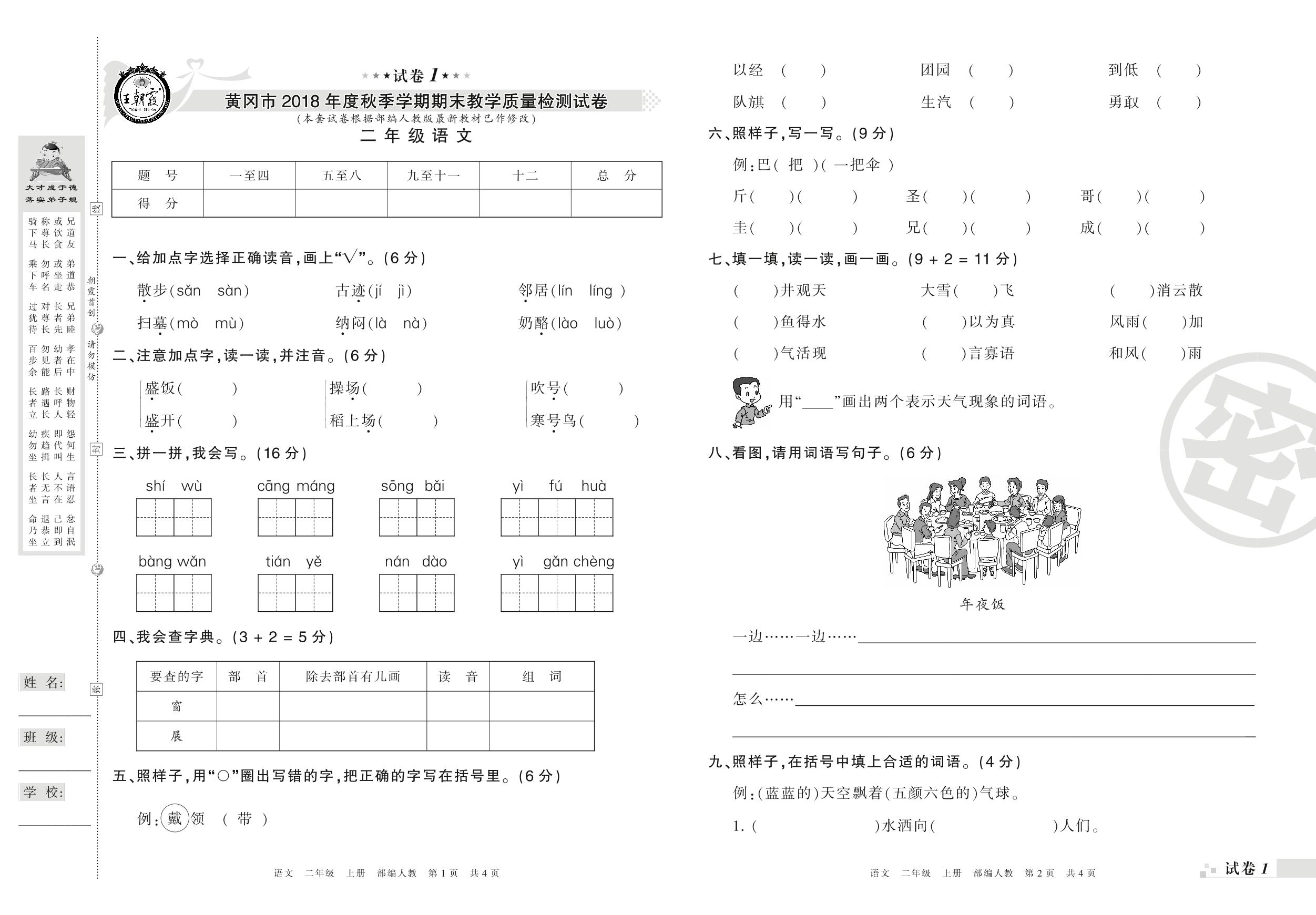 2018-2019学年第一学期黄冈市二年级语文试卷(人教版)【1】